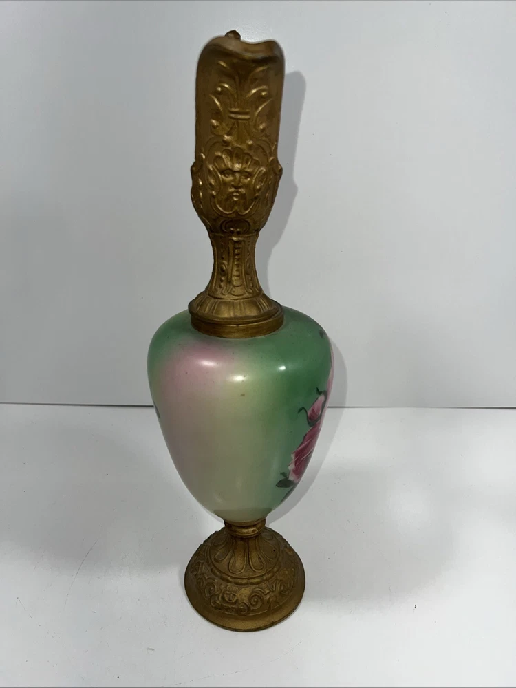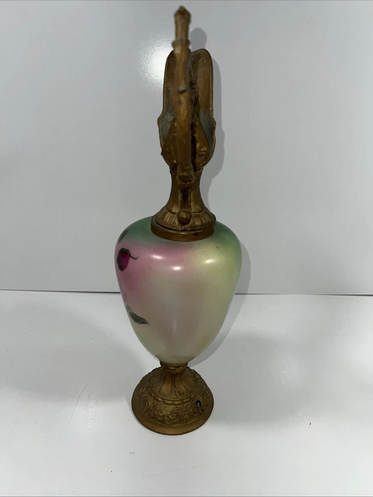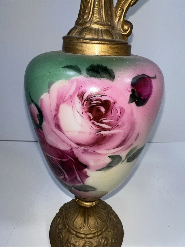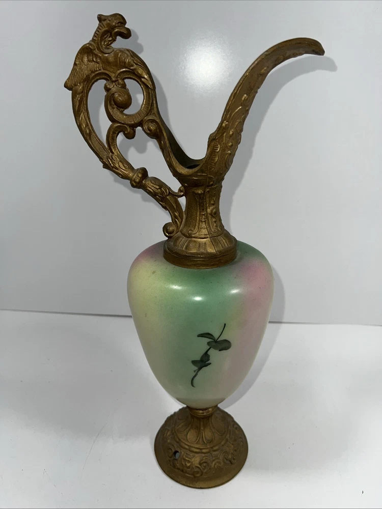 This antique French ewer is a stunning hand-painted glass vase with painted metal mounts. Standing 15 inches tall, this vase features a floral pattern and a French style, making it a beautiful and unique decorative piece. The vase is from the late 19th or early 20th century, originating from France, and weighs 2.5 lbs. Its antique finish adds to its charm, and the intricate detailing showcases its craftsmanship. Perfect for collectors or those looking to add a touch of vintage elegance to their home decor.