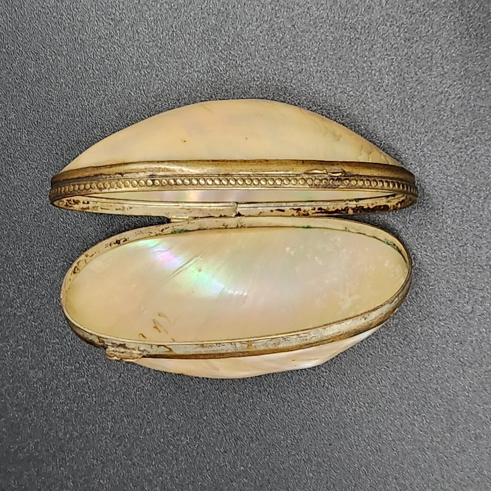 This exquisite antique pill/trinket box is crafted from lustrous mother of pearl, featuring a unique clamshell design and elegant metal trim. Its compact size makes it a functional and stylish addition to your collection, and its antique appeal adds a touch of sophistication to your personal items. • Clamshell design with metal trim • Antique age • Compact and portable • Height = 1.75 inches. Very good antique condition. One minor surface crack on the inside of the piece. The gilt ormolu has a very heavy patina. See photos for details.