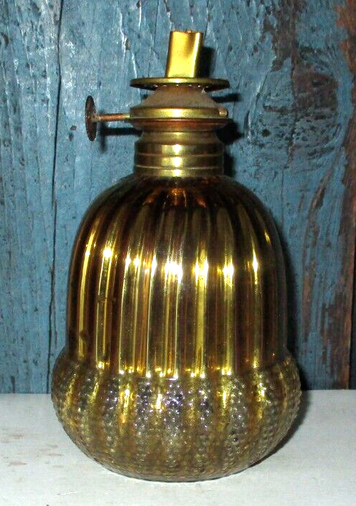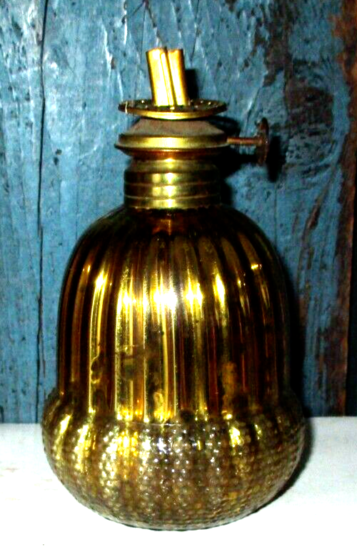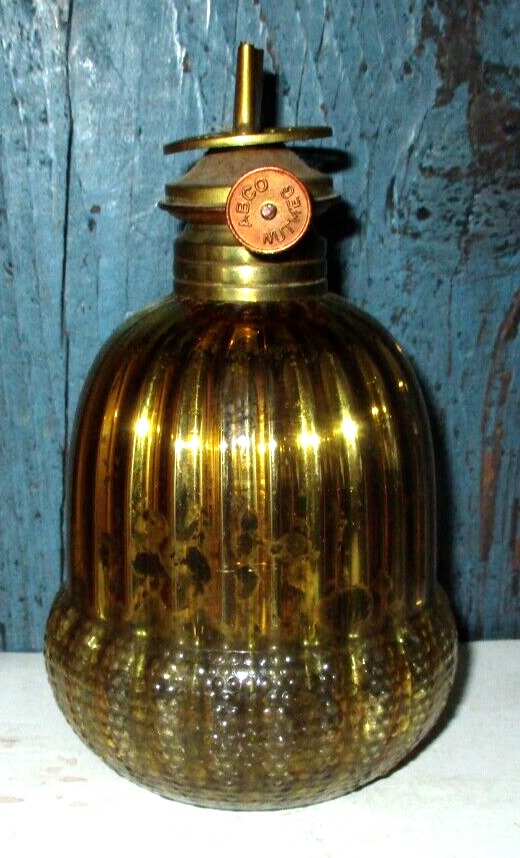 Up for consideration this antique miniature yellow glass sprayed inside with gold mercury above oil lamp with brass Abco Nutmeg burner. Measuring 5 1/4" tall; pictures show good used condition with no chimney. Please enlarge all pictures to see details.