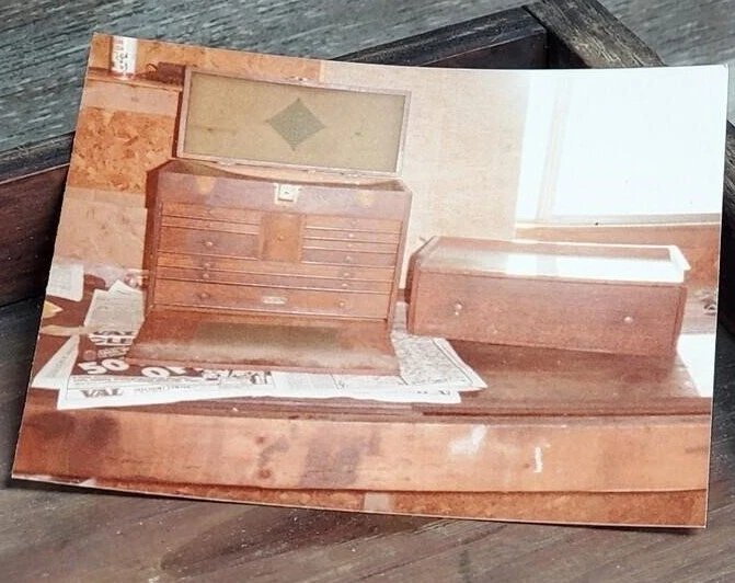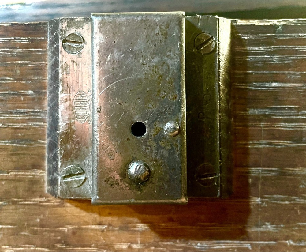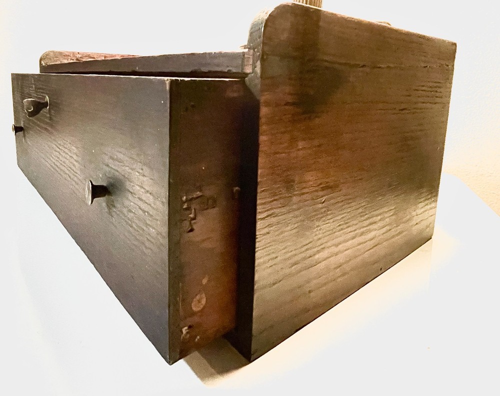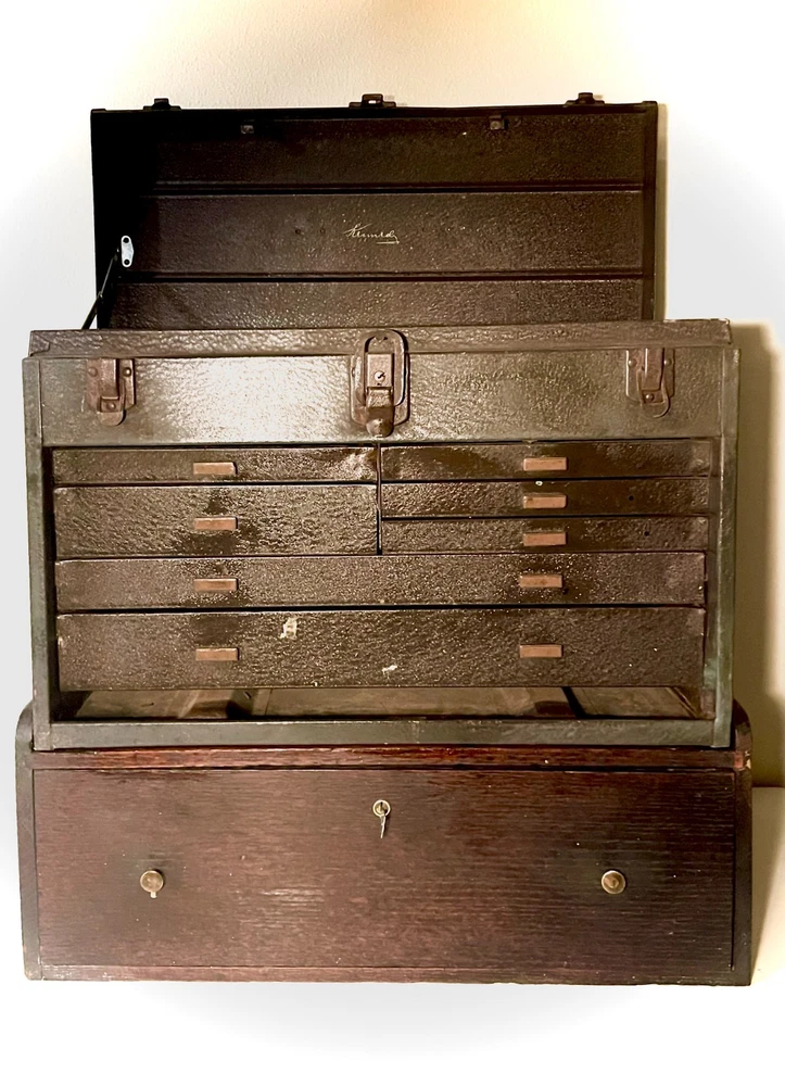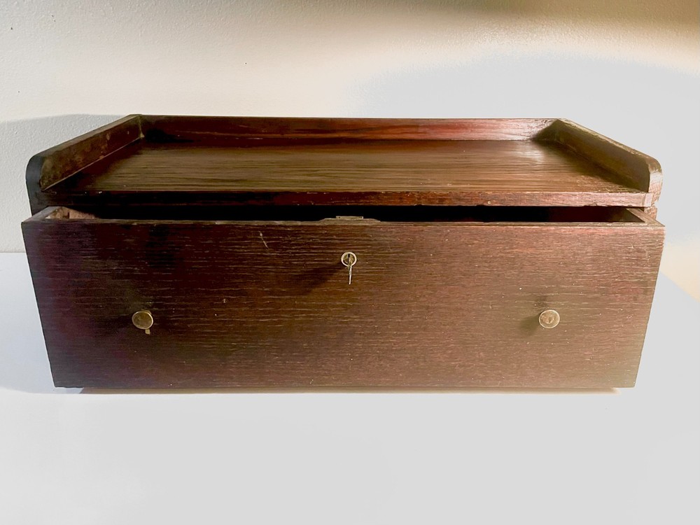 Antique keyed and locking single drawer riser or intermediate box for an antique wood or metal Gerstner or Union machinist tool chest in oak. Fits a standard sized machinist tool chest perfectly. Includes a key to the original Corbin branded locking mechanism and original brass knobs. Please note that the box has been repaired in the past and is altered but doesn't affect its functionality. See condition section for details. Dimensions: 20.25" X 10" X 8.25"