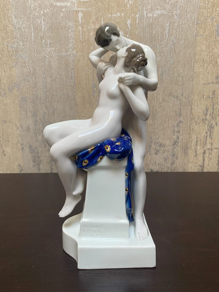 Antique Rosenthal "Spring Of Love - The Kiss" Porcelain Figurine Richard Aigner Rosenthal Porcelain Figurine, No 295 "Liebesfrühling, Der Kuss / Spring of Love, The Kiss", by Richard Aigner München. A kissing couple - a sitting woman kisses a standing man. On the bottom of the figure is the stamp of the manufacturer Rosenthal. On the base of the figure is written in raised lettering "Richard Aigner München". 10.5" tall Base 4.5" x 3.5"