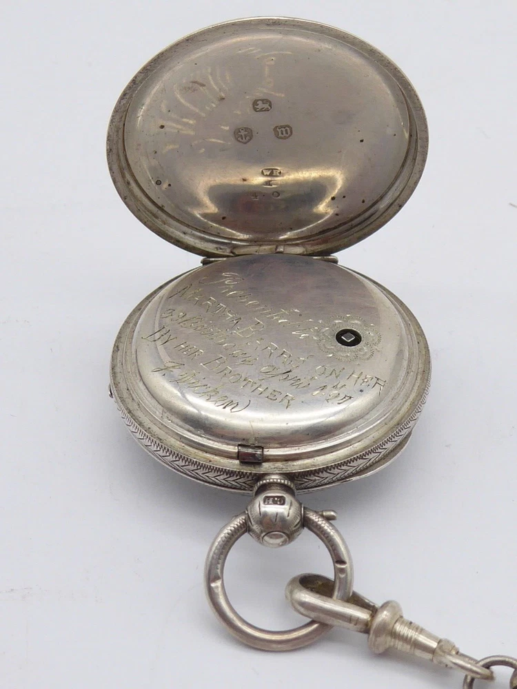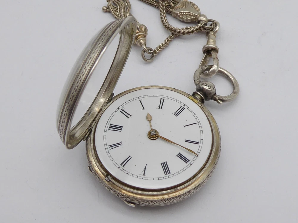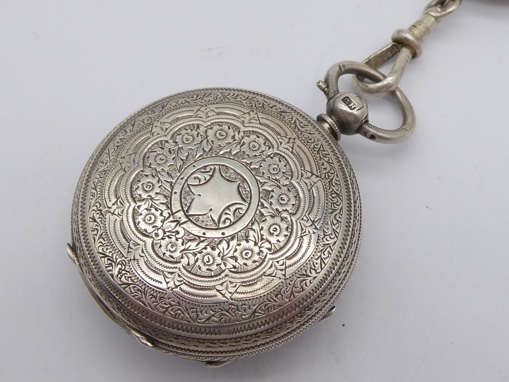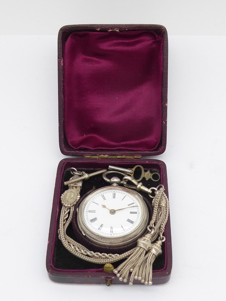 Offered for auction is a superb antique Victorian ladies solid sterling silver fob / pocket watch with Albertina in box. The watch is hallmarked for Birmingham 1896 by William Ehrhardt. A Fine quality example with beautiful engraved decoration to the case. The Albertina is unmarked but tested as silver and has two tassel fobs attatched. The watch comes with key. The watch measures approx. 41 mm wide. The Albertina is approx. 22.5 cm long including tassels Thanks for looking, please check out my other items and add me to your favourite sellers for similar items listed every week Please note all items are listed for auction without reserve and with no buy it now prices