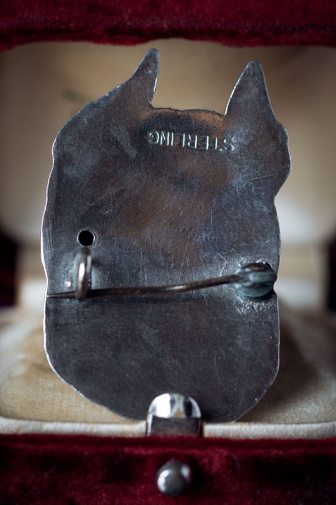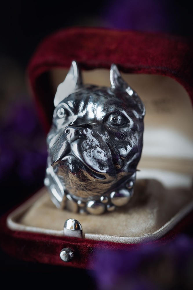 Is it a Boston? Is it a Frenchie? Is it a pitbull or possibly a mutt? While we believe this brooch was most likely modeled after a Staffordshire terrier, we really just think it's a sweet little pup! This highly expressive, 3-dimensional pin is crafted in sterling silver with loads of details that bring this piece to life! A true dog owner's delight! Date: 1890s-1900s Materials: Sterling silver Measurements: 1.5" x 1" Markings: Sterling Condition: Very Good. This piece was completely black with tarnish when we found it. We have cleaned, scrubbed and polished it to the best of our ability. There is still a small bit of verdigris on the hinge of the clasp. It has been improved upon more since this photo was taken. The pin back is slightly bent from years of wear. Cleaning and Care: Clean gently with warm soap and water and a soft bristled brush. Dry thoroughly. Polish with a silver cloth if needed.
