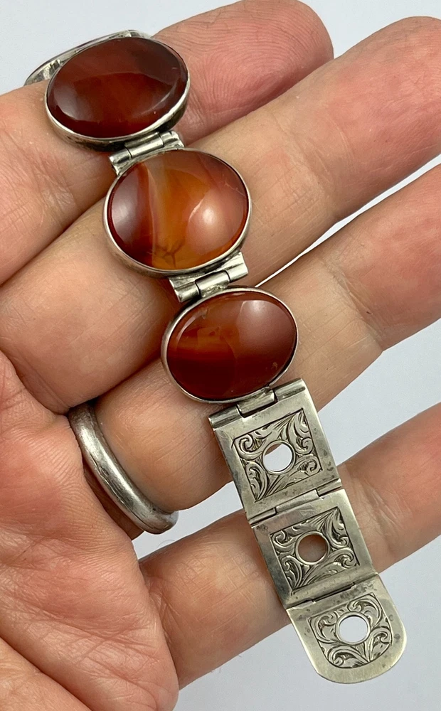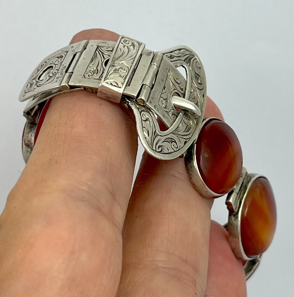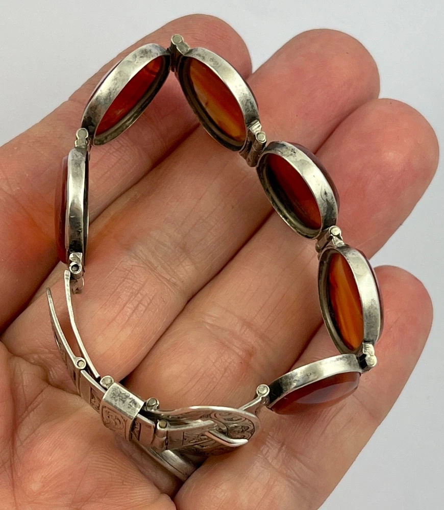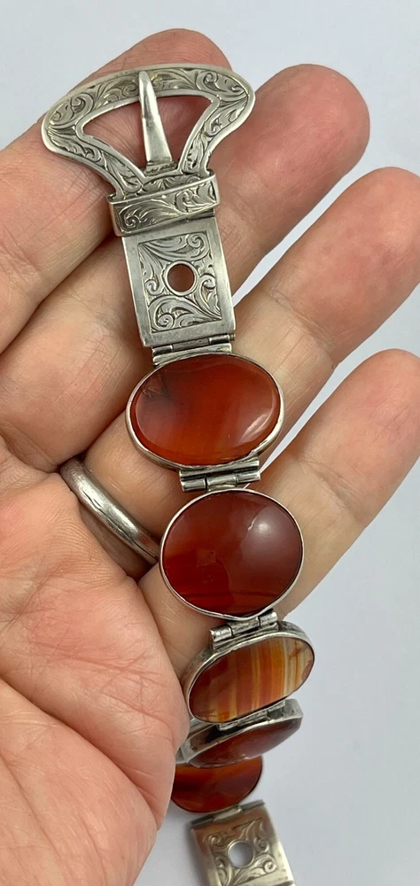 This is an stunning antique Victorian circa 1890, sterling silver Scottish agate belt buckle design bracelet. The stones are classic graduated banded carnelian agates from near Cupar in Fife. The bracelet has no hallmarks which is fairly normal for pieces from this period but has been fully tested and is sterling silver. The bracelet length is adjustable from approx. 15 cm ( six inches ) to 18 cm ( seven inches ) and the weight is 29.8 grams If when you receive your winning item and for any reason are not happy with the purchase please get in touch before leaving feedback and I will endeavour to resolve any issue you may have amicably. I have a returns policy which allows you to send any item back within 7 days of receipt. I always show high magnification pictures of my items to show as much detail as possible as it is not always possible to list every point in a description. As with all my auctions the bidding starts LOW and there is NO reserve! Please check out my other Jewellery auctions and remember that savings on shipping will be made for multiple purchases! I offer two shipping services to the UK and one worldwide. The special delivery (UK) and Airsure (worldwide) provides full insurance for any item.