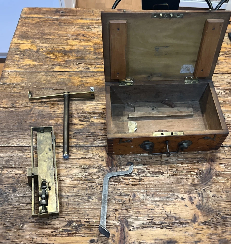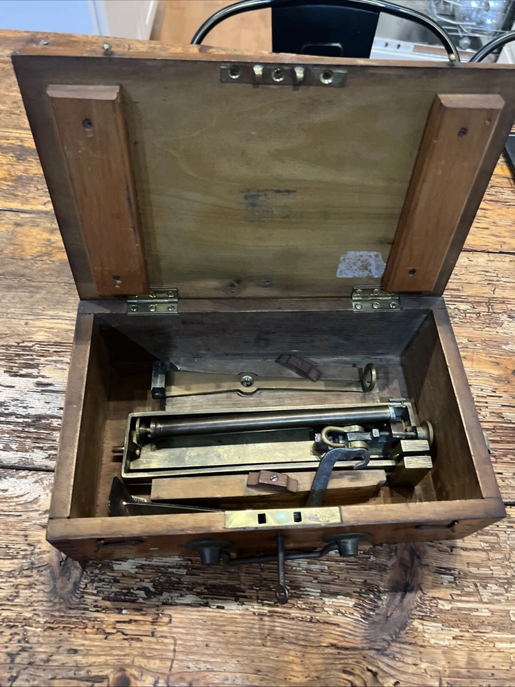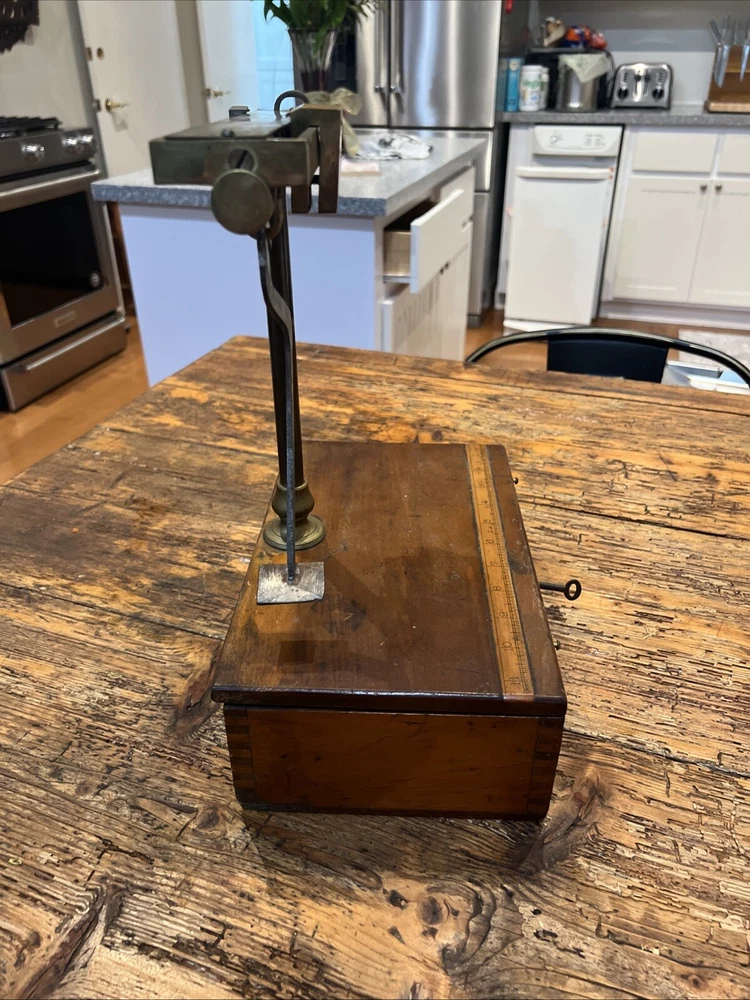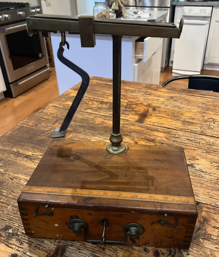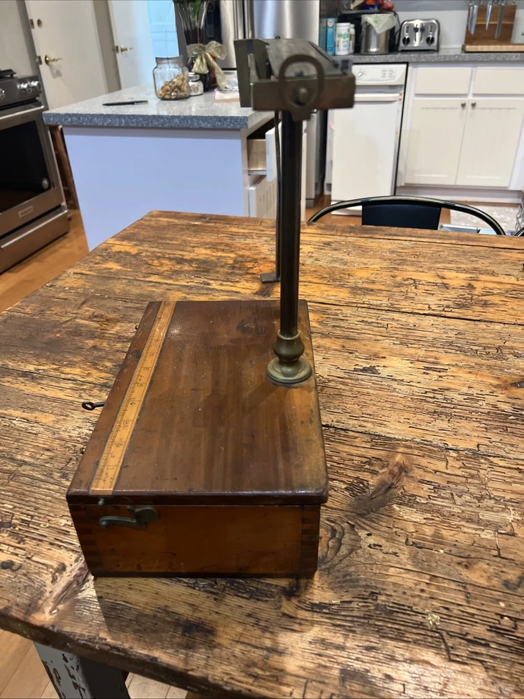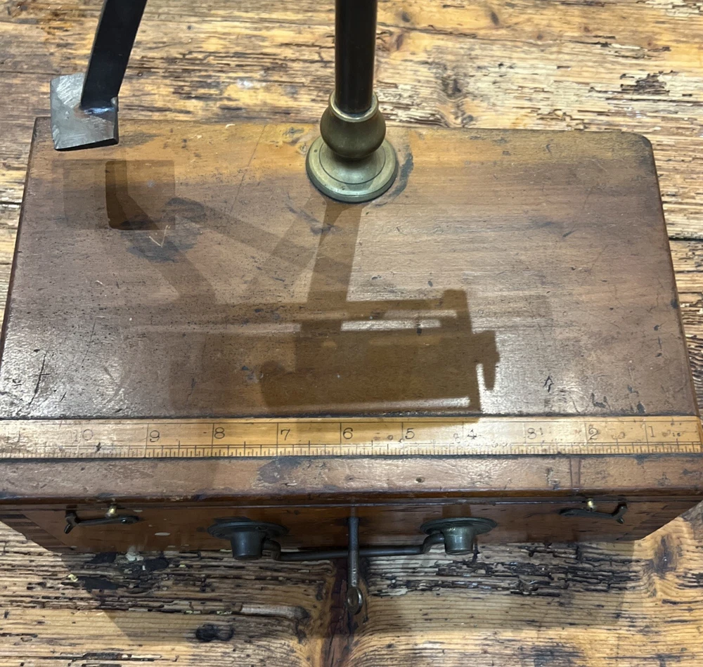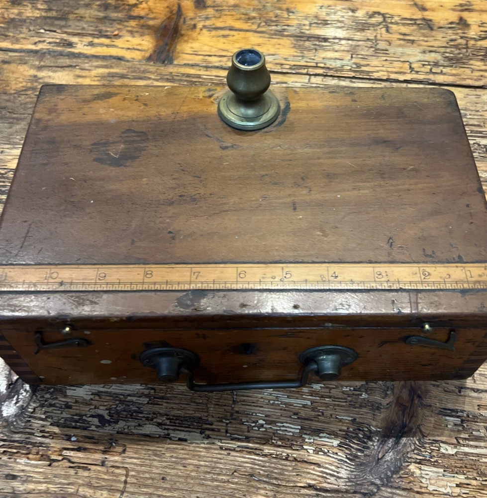This is a unique fabulous Antique fishing box. Circa 1860-1880 . Beautiful dovetailed corners. Excellent 4 scale. Inlaid 12 inches tall ruler on top. Don’t miss this one .