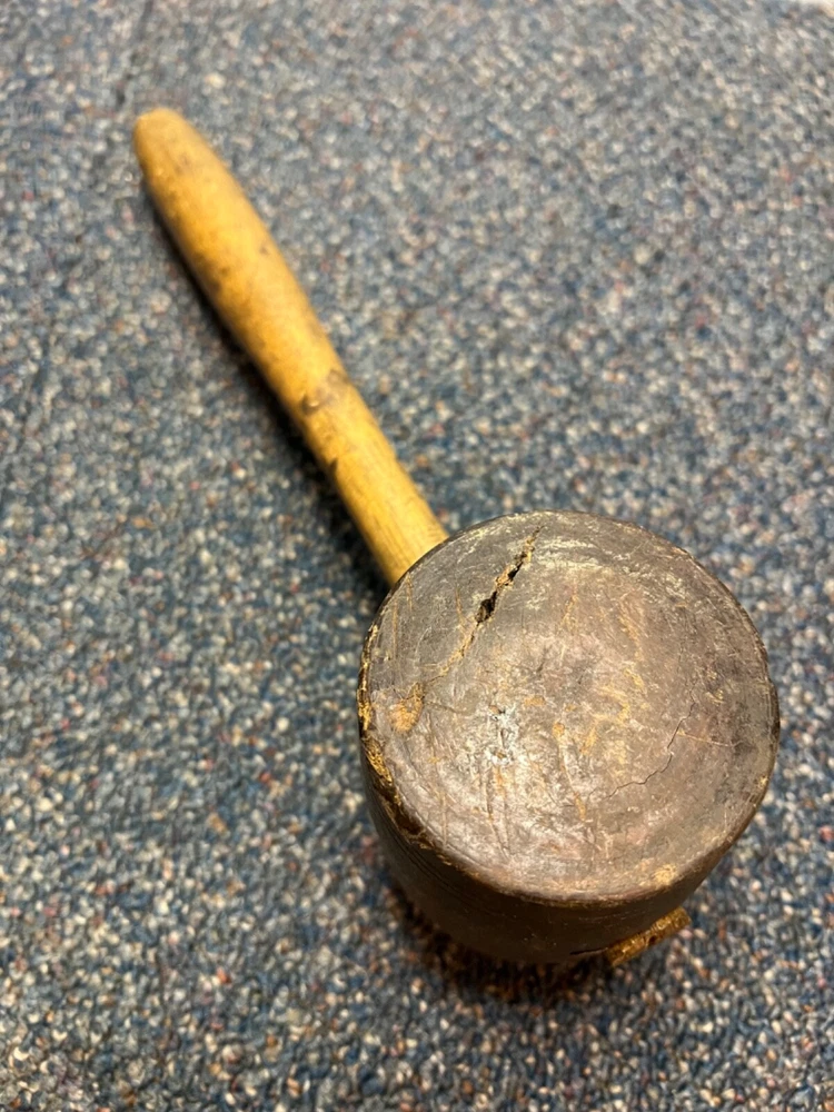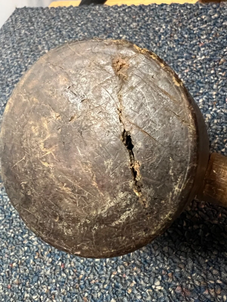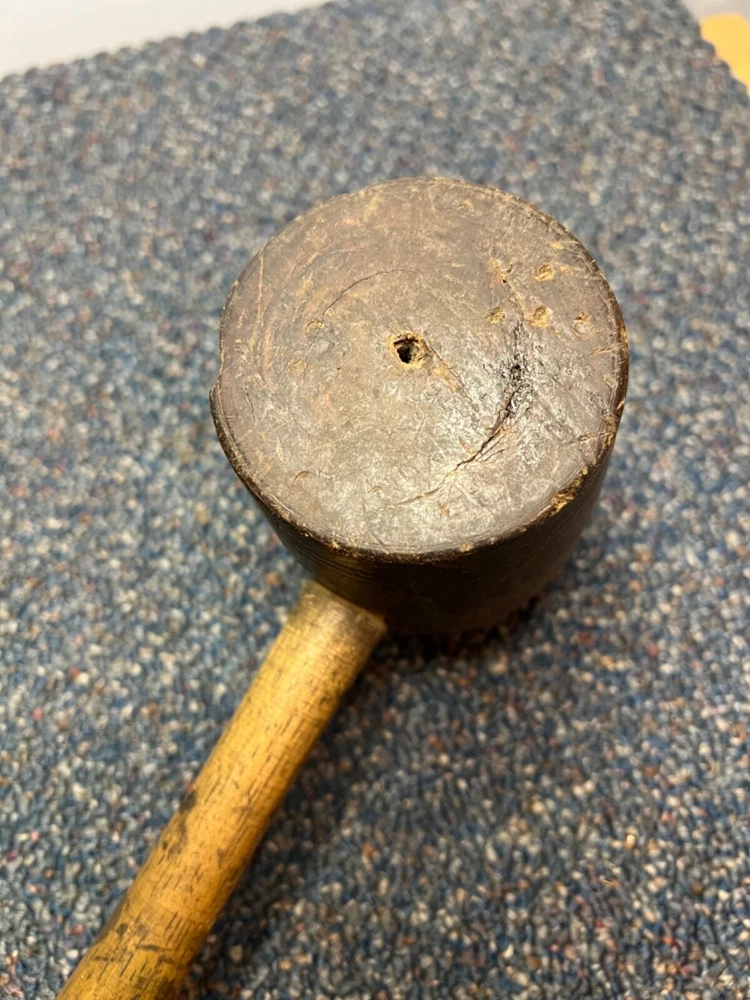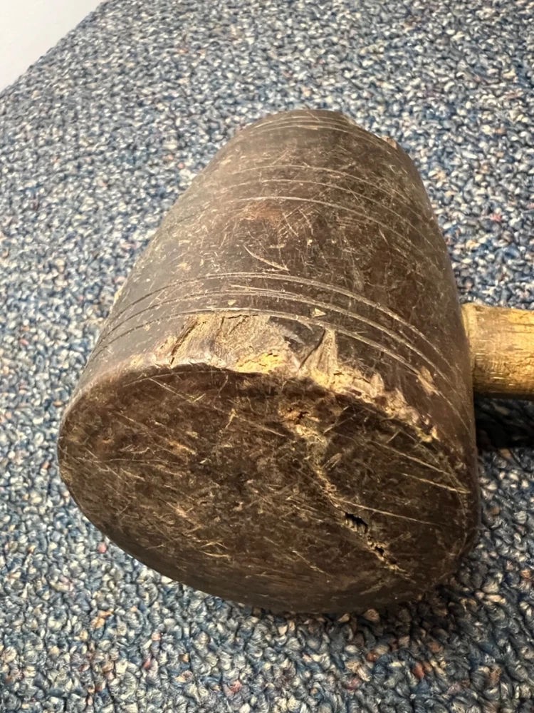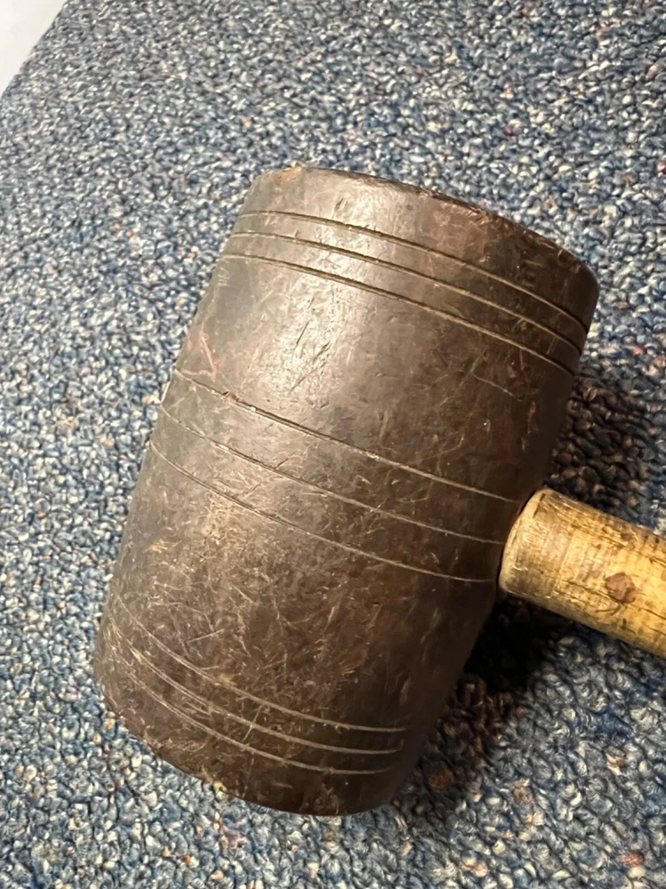 Here's a magnificent old lignum vitae mallet. Weight is 1 lb, 9 oz. There's no mark or brand visible. Handle length is 9", head length is 4 1/4", diameter is 3". The head has its share of dings and chips, and a couple of fissures in the striking faces, but considering it's likely well over 100 years old, it's in remarkably good condition. See pics. The handle is in great shape, with just surface marks, but no real damage. The head and handle are firmly mated. This one probably built a few post-and-beam buildings in its day. Its patina is off the charts. - a real treasure from the past.