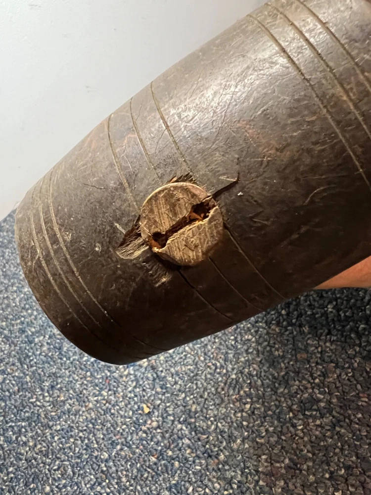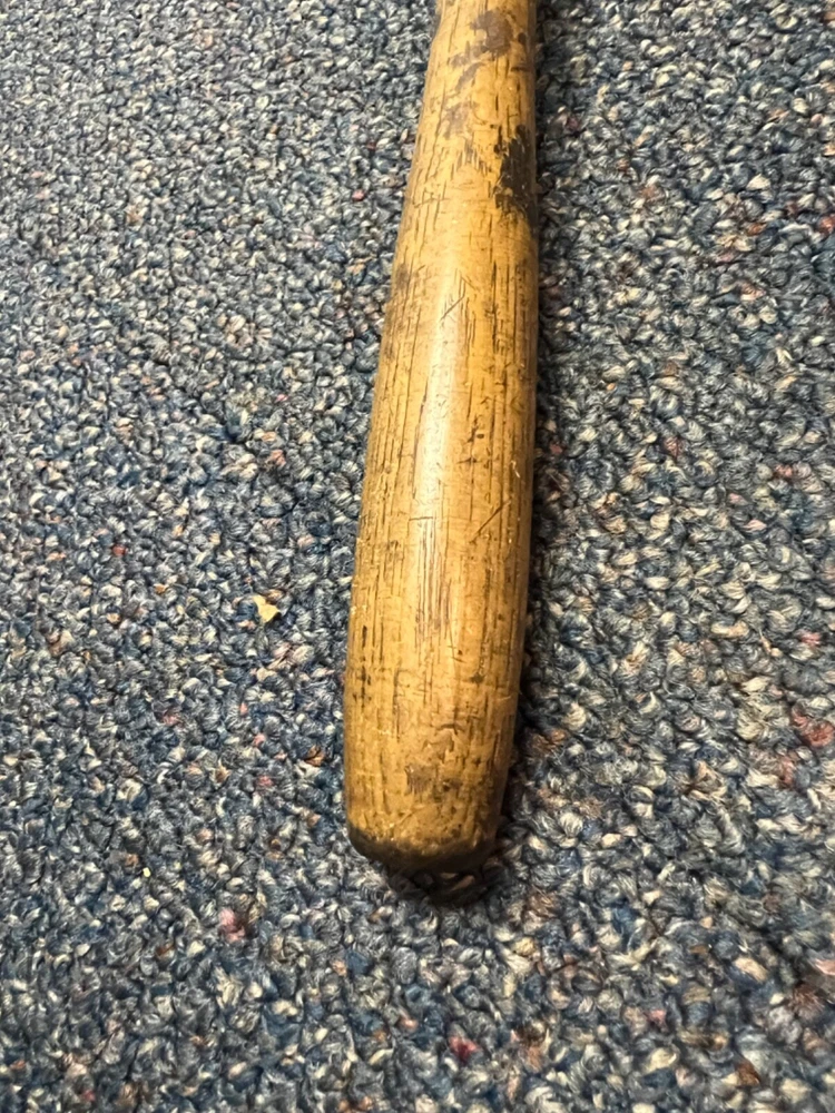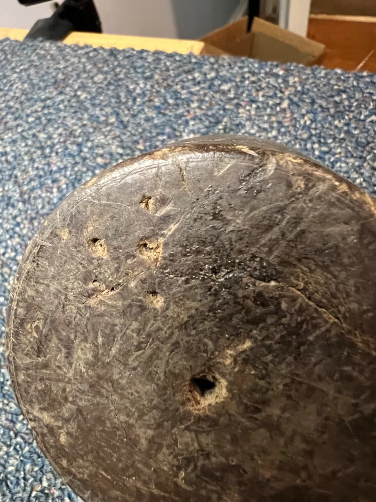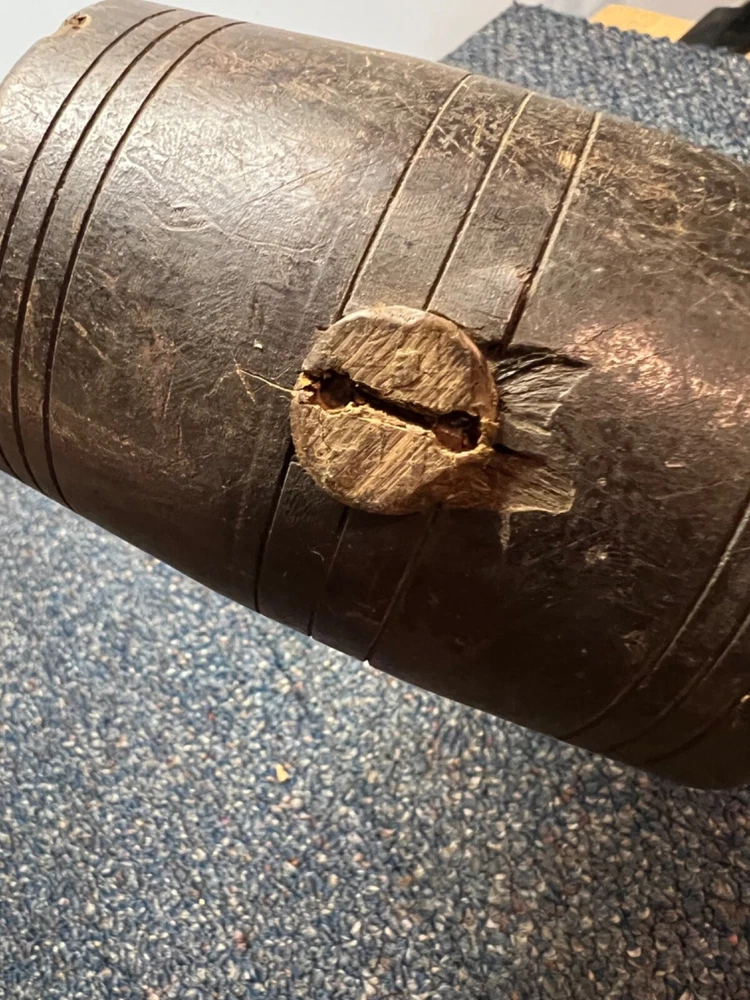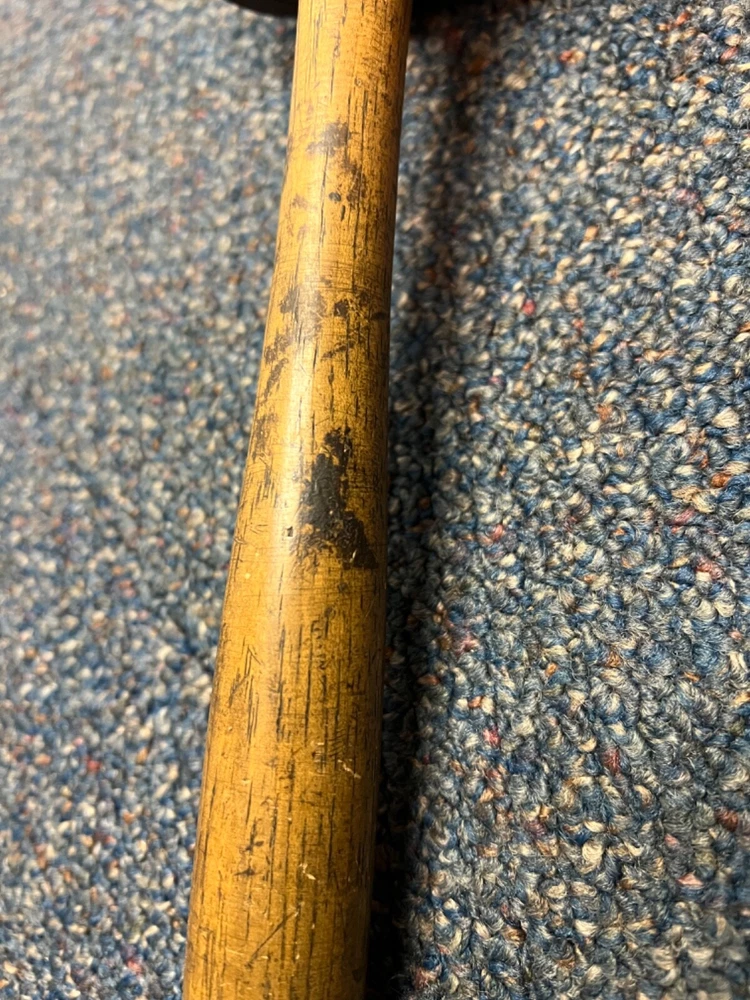 Here's a magnificent old lignum vitae mallet. Weight is 1 lb, 9 oz. There's no mark or brand visible. Handle length is 9", head length is 4 1/4", diameter is 3". The head has its share of dings and chips, and a couple of fissures in the striking faces, but considering it's likely well over 100 years old, it's in remarkably good condition. See pics. The handle is in great shape, with just surface marks, but no real damage. The head and handle are firmly mated. This one probably built a few post-and-beam buildings in its day. Its patina is off the charts. - a real treasure from the past.