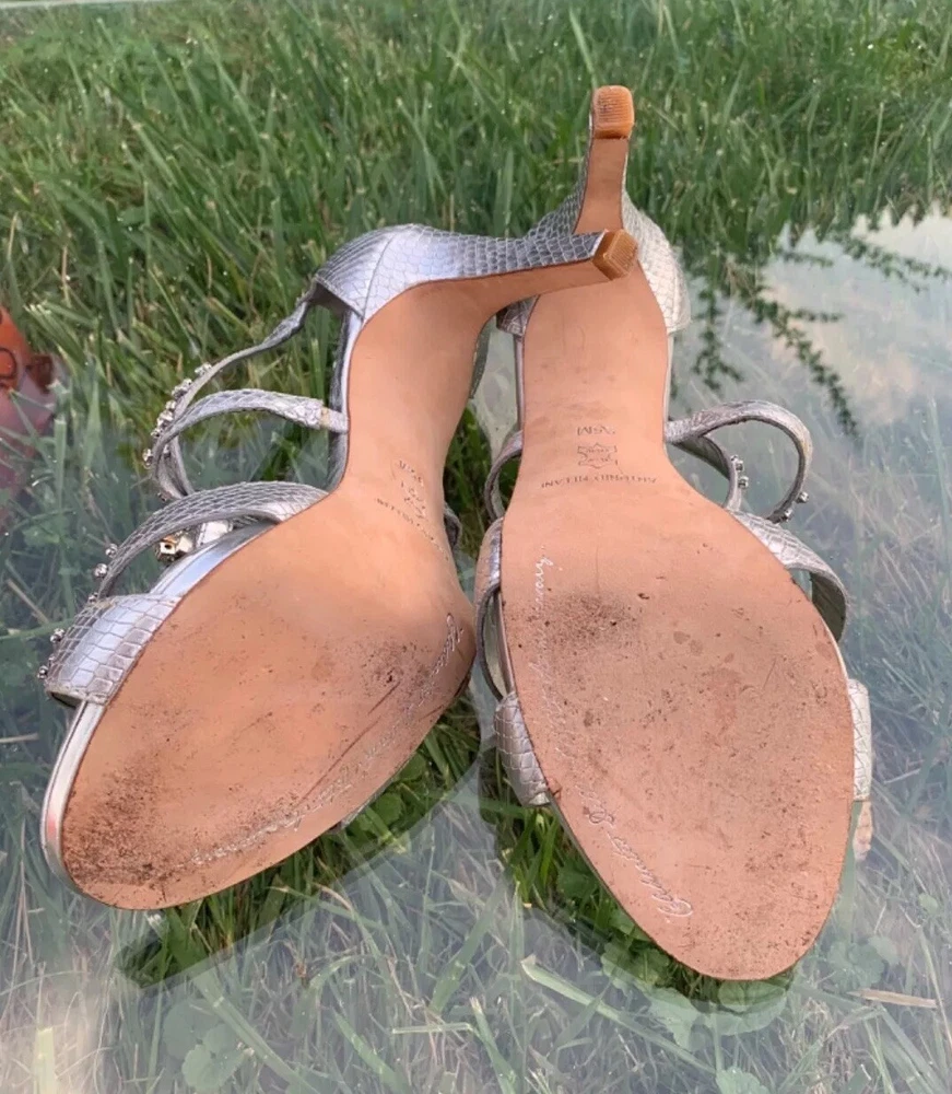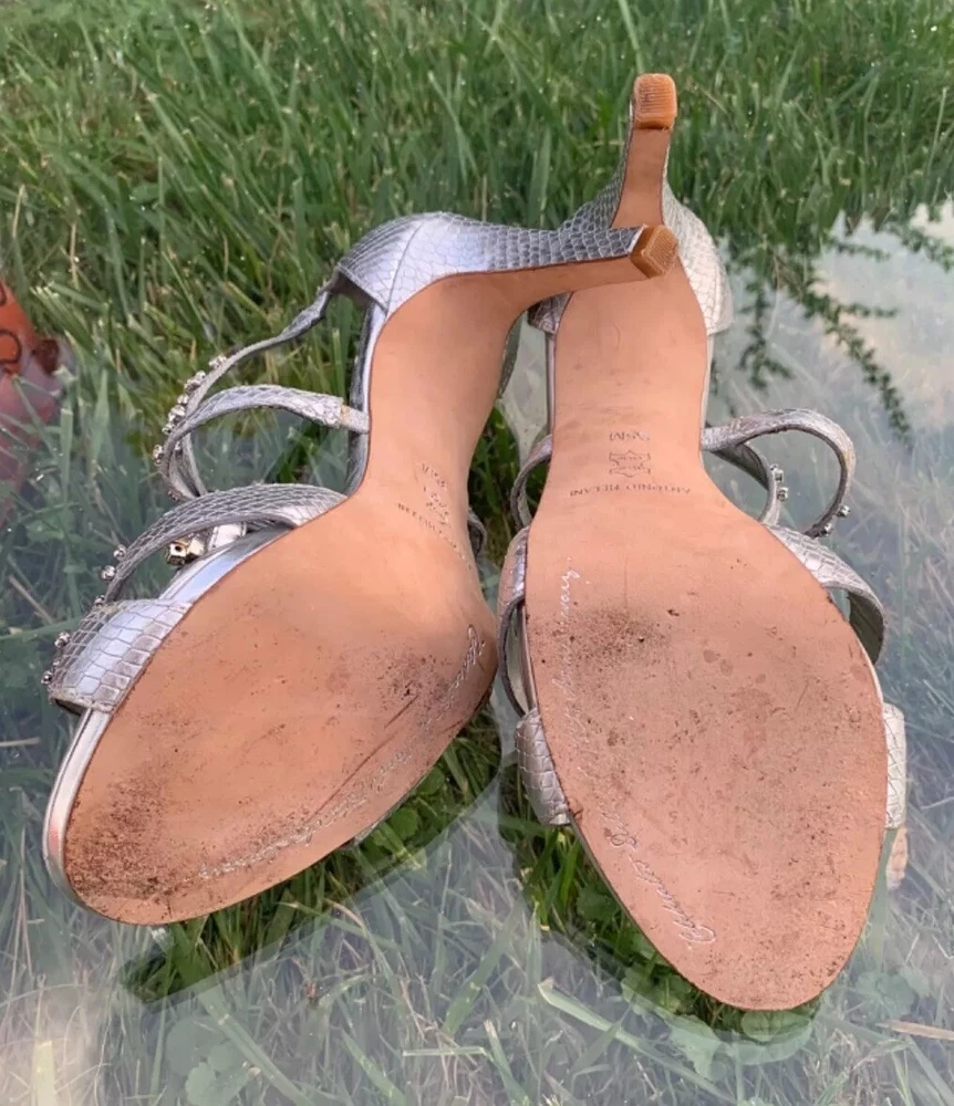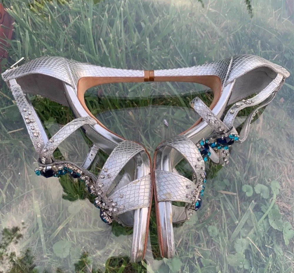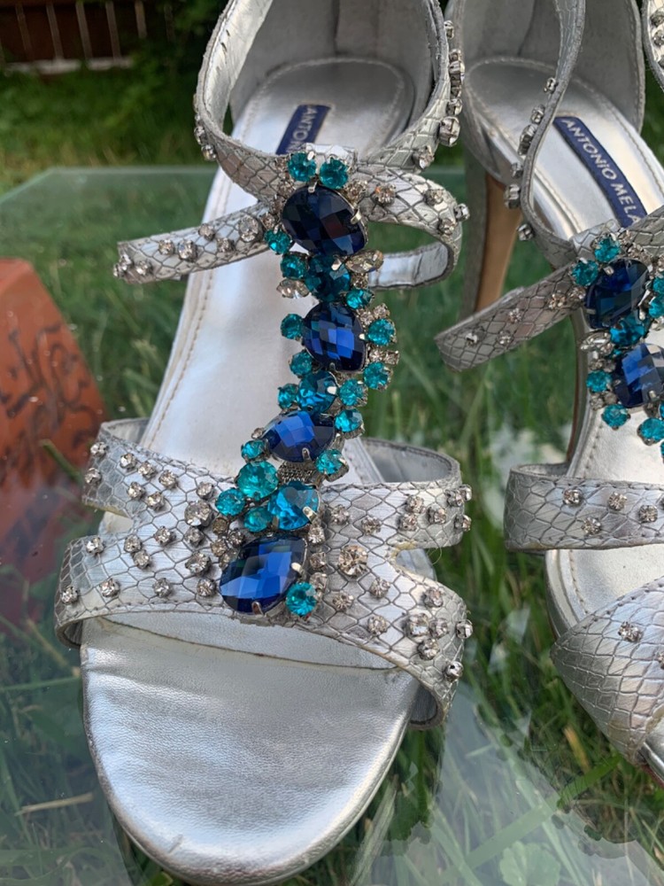 Elevate your look with these stunning Antonio Melani strappy high heels. The silver and blue color combination, glitter pattern, and rhinestone accents make them perfect for any occasion - from weddings and formal events to parties and cocktails. The ultra-high stiletto heel adds extra height and glamour, while the open toe and zip closure provide comfort and ease of wear. Crafted with leather outsole and lining, these heels ensure durability and long-lasting wear. The 1-inch platform height gives a lift to your silhouette, while the standard shoe width provides a comfortable fit. Whether it's summer, fall or spring, these shoes are perfect for any season. Add a touch of metal theme to your outfit with these stylish heels.