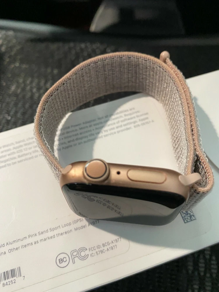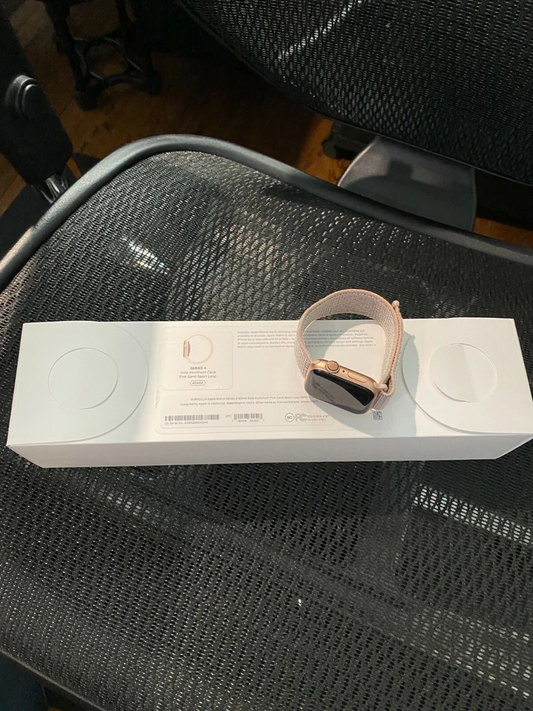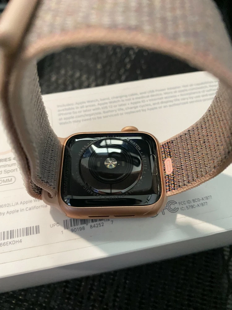 Apple Watch Series 4 (GPS) 40mm Gold Aluminum Case with Pink Sand Sport Loop - Gold Aluminum Description Fundamentally redesigned and reengineered. The largest Apple Watch display yet. Built-in electrical heart sensor. New Digital Crown with haptic feedback. Low and high heart rate notifications. Fall detection and Emergency SOS. New Breathe watch faces. Automatic workout detection. New yoga and hiking workouts. Advanced features for runners like cadence and pace alerts. New head-to-head competitions. Activity sharing with friends. Personalized coaching. Monthly challenges and achievement awards. You can use Walkie-Talkie, make phone calls, and send messages. Listen to Apple Music¹ and Apple Podcasts. And use Siri in all-new ways. Apple Watch Series 4 lets you do it all right from your wrist. Features GPS Over 30% larger display² Electrical and optical heart sensors Digital Crown with haptic feedback 50% louder speaker² S4 SiP with faster 64-bit dual-core processor Improved accelerometer and gyroscope for fall detection Swimproof³ watchOS 5 Aluminum case Selection may vary; see a sales associate for available models. Apple Watch Series 4 (GPS) requires an iPhone 5s or later with iOS 12 or later. ¹Apple Music requires a subscription. ²Compared with the previous generation.