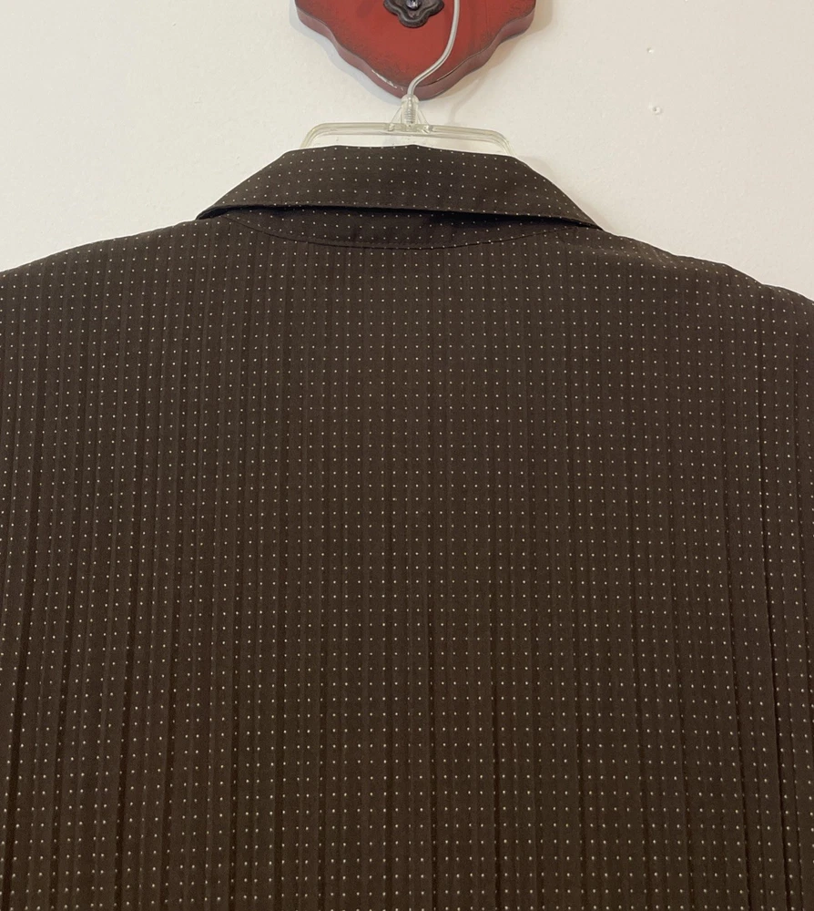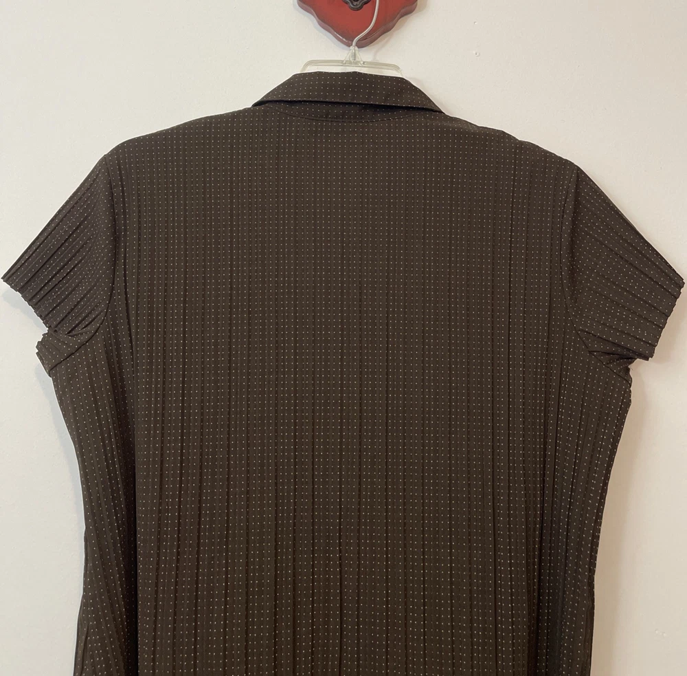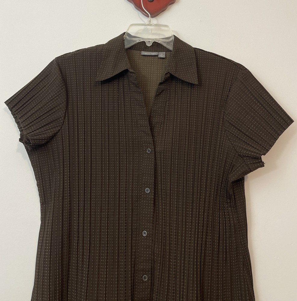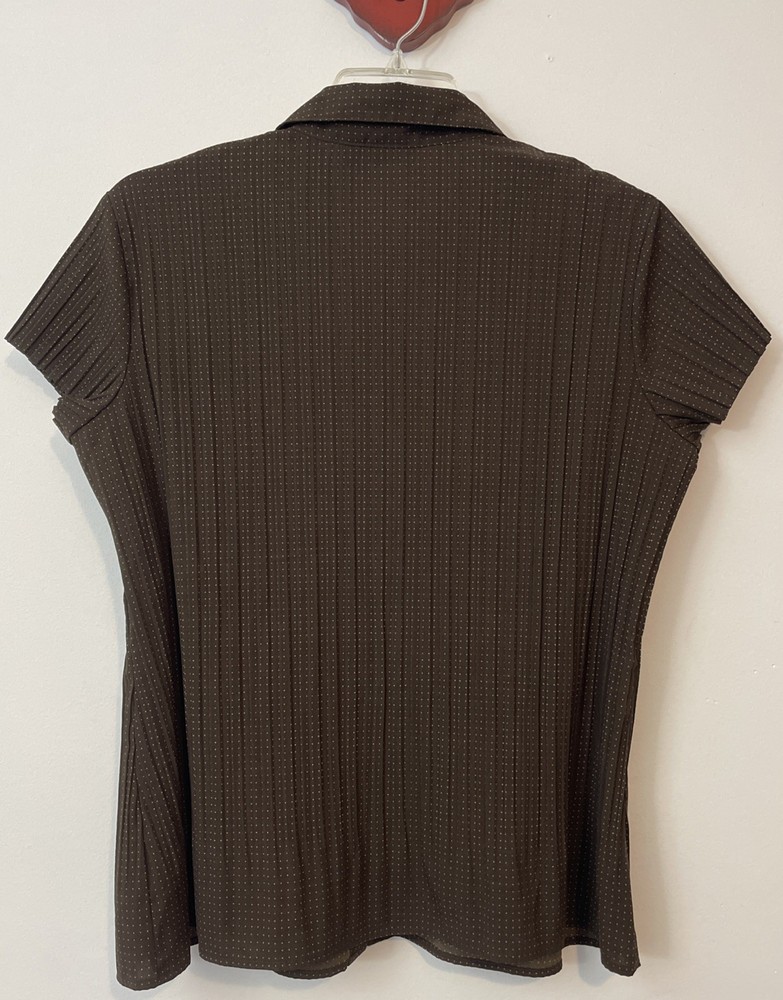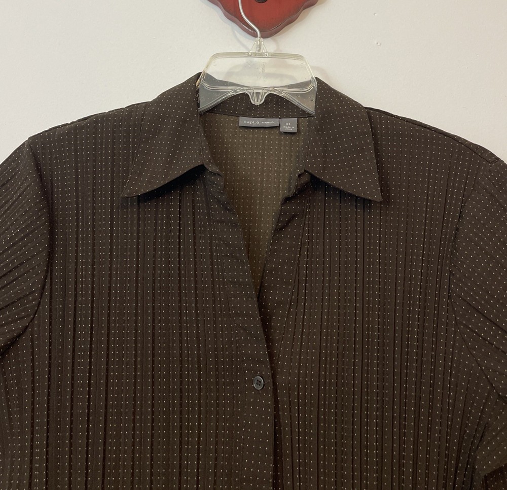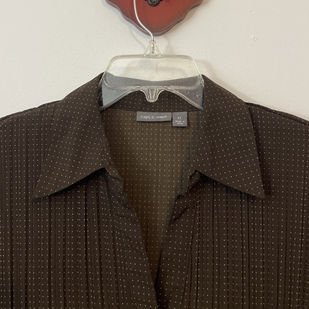 This women's XL brown polka dot blouse from Apt 9 is stretchy and stylish! It features a V-neckline, short sleeves, and a full button closure. The blouse is made from a blend of polyester and spandex, offering stretch and breathability. With pleated accents, it fits in a regular size type, making it suitable for all seasons and occasions. The classic style and easy-care fabric make it a versatile and comfortable choice for any woman's wardrobe. Length: 27 inches. Chest: 21 inches across laying flat.