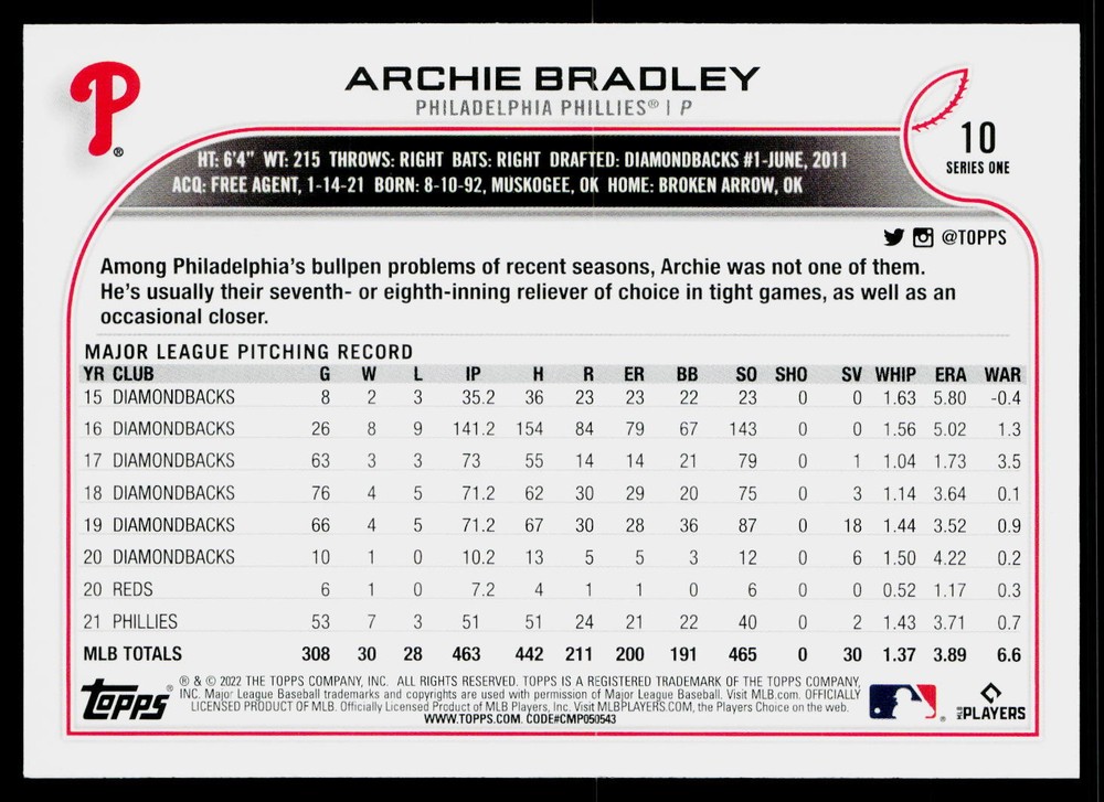 You will receive a , Archie Bradley 2022 Topps #10 Philadelphia Phillies Near Mint or Better condition. Please note i am not a professional card grader the condition of raw cards can be very subjective. Please refer to the high quality pictures to determine condition yourself any questions at all please feel free to ask!! we take pride in the quality of cards we sell and ship, all cards will be shipped in a penny sleeve and top loader for added protection. be sure to save us as a seller, as we are growing and listing daily THANK YOU FOR YOUR BUSINESS