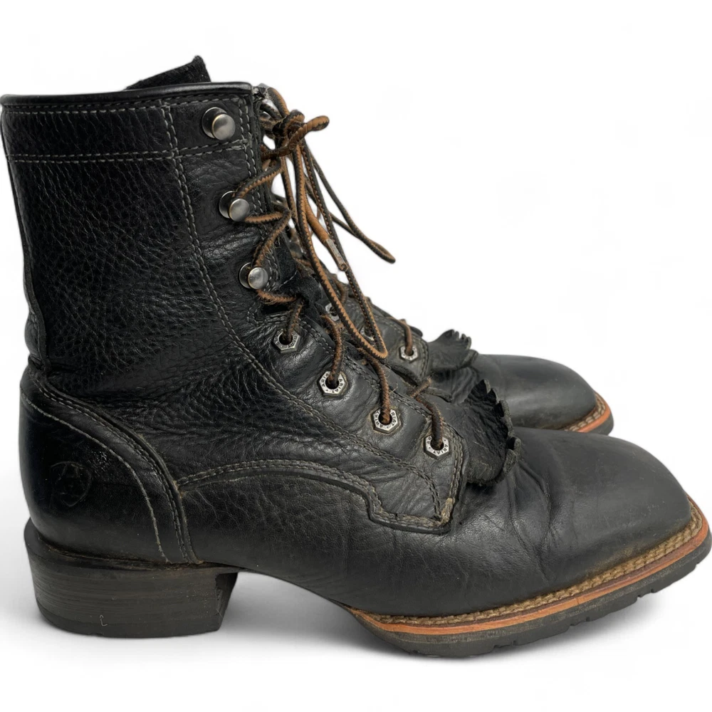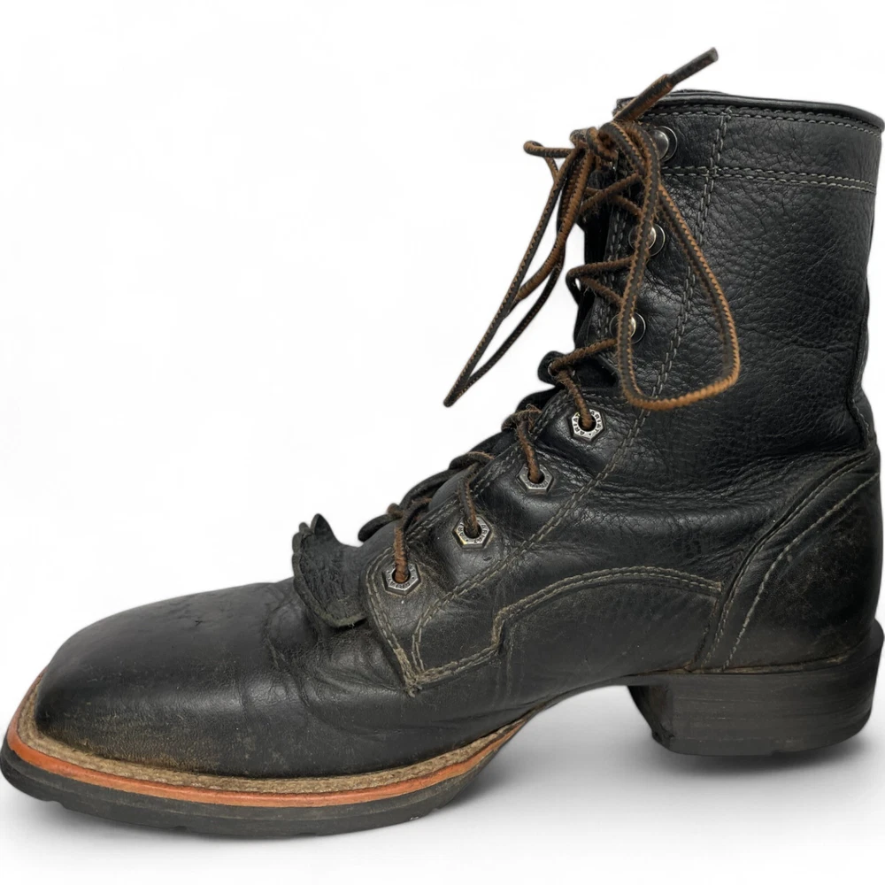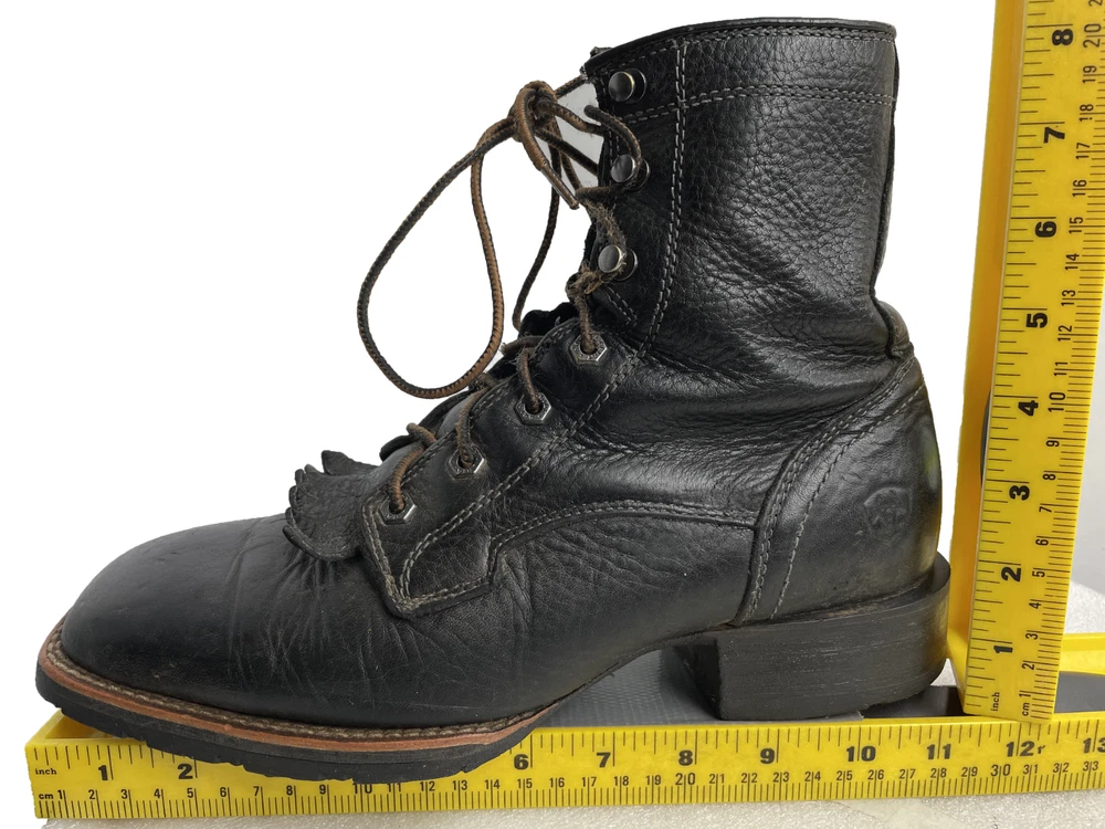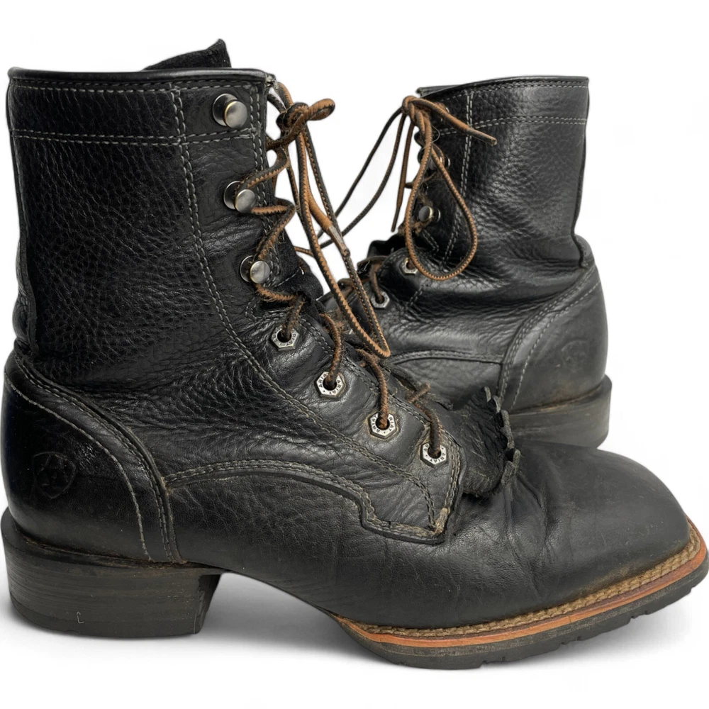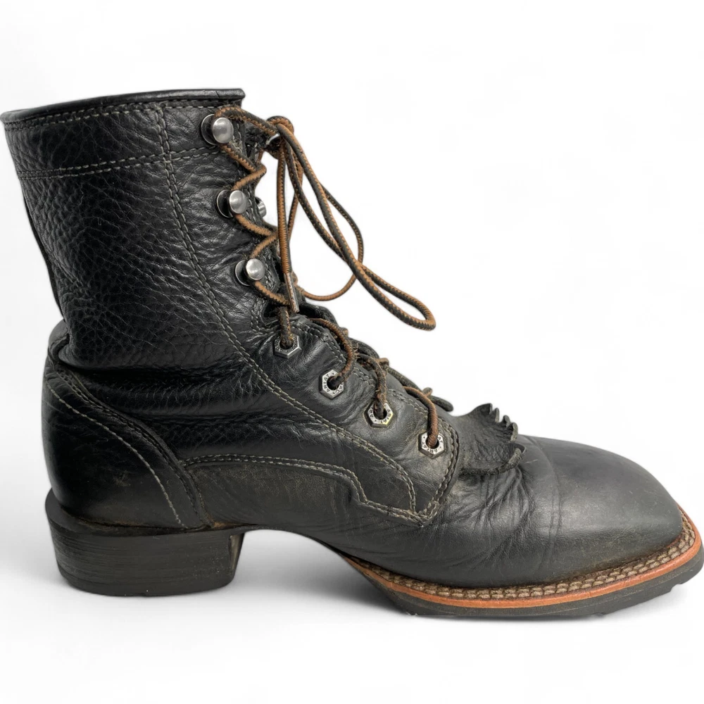 Toe Shape: Square Toe Product Line: Ariat Hybrid Lacer Brand: Ariat Closure: Lace Up US Shoe Size: 8 Style: Work Theme: Biker, Cowboy, Western, Work Type: Boot Pattern: Solid Features: Comfort Upper Material: Leather Shoe Width: D Color: Black Model: Ariat 10012777 Accents: Embroidered Department: Men