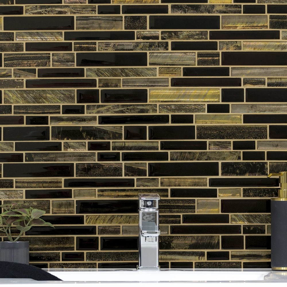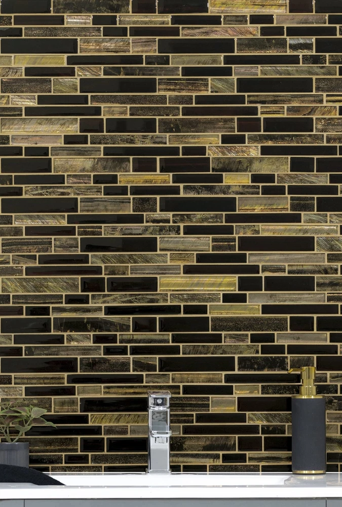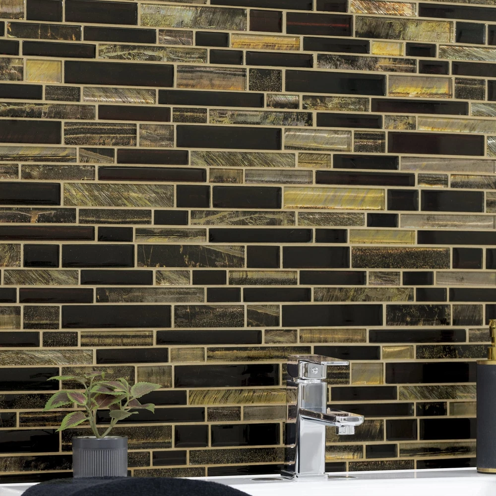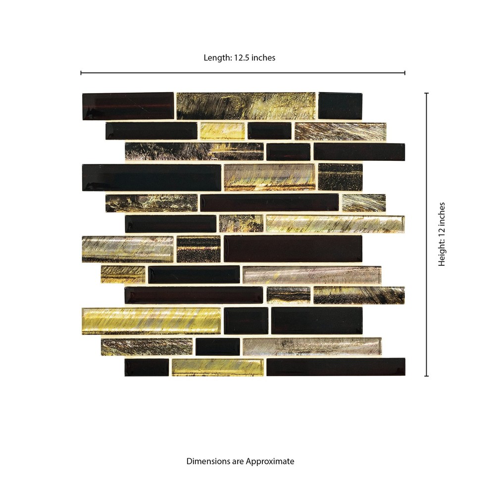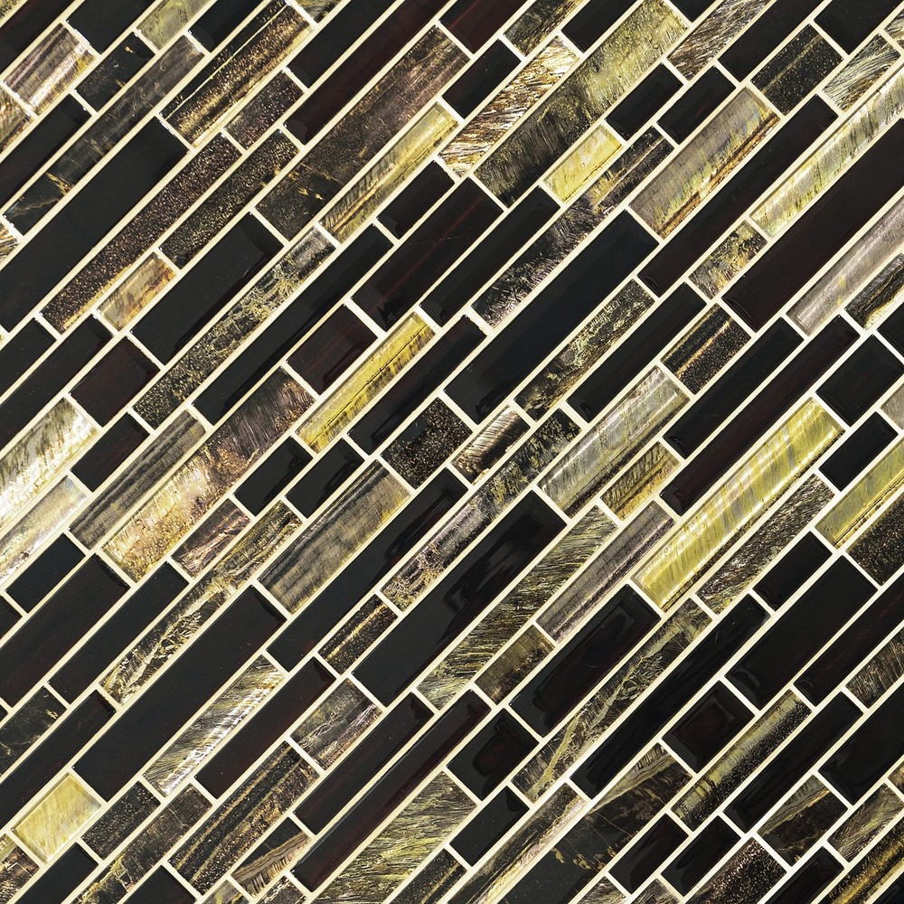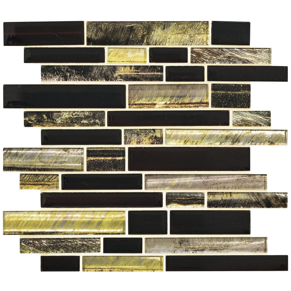 Features warm golds and browns with a reflective high sheen Glass mosaic makes a great accent band or kitchen backsplash Grade 1, glass blend mosaic tile for wall and countertop use 12 in. width x 12 in. length x 8 mm thick mesh-mounted mosaic. Varying width and length brick pieces It is recommended you purchase a minimum of 10% overage to account for design cuts and patterns