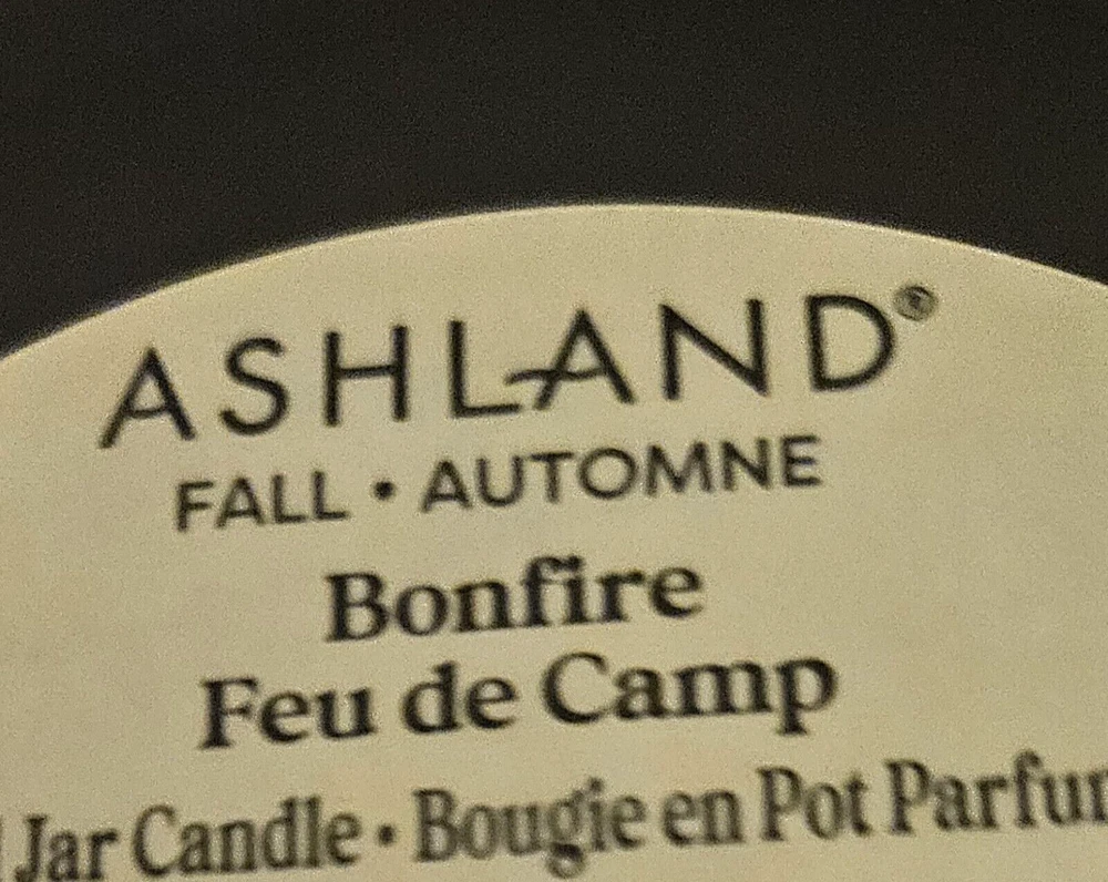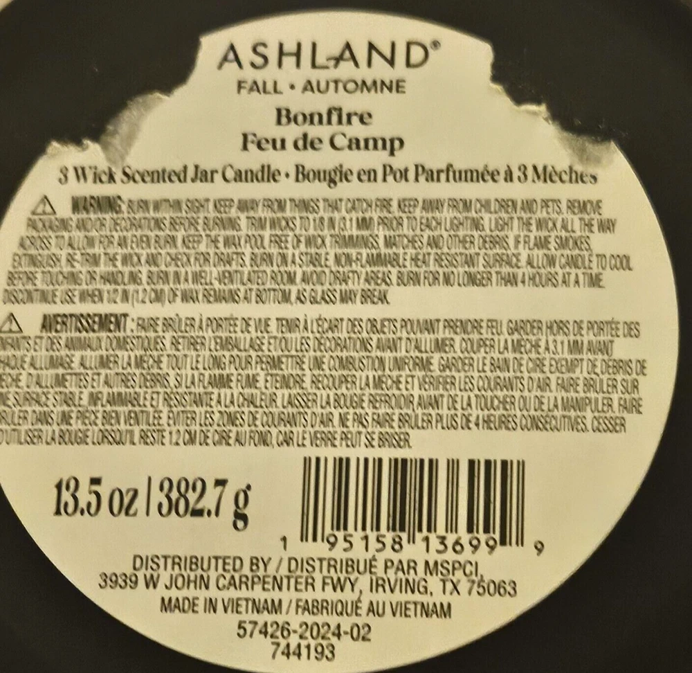 Bonfire 3 wick scented candle 13.5 oz comes in a Frosted black jar with cork lid P araffin and palm wax, glass, wood and fragrance 5.11" x 3.15" Bonfire scent