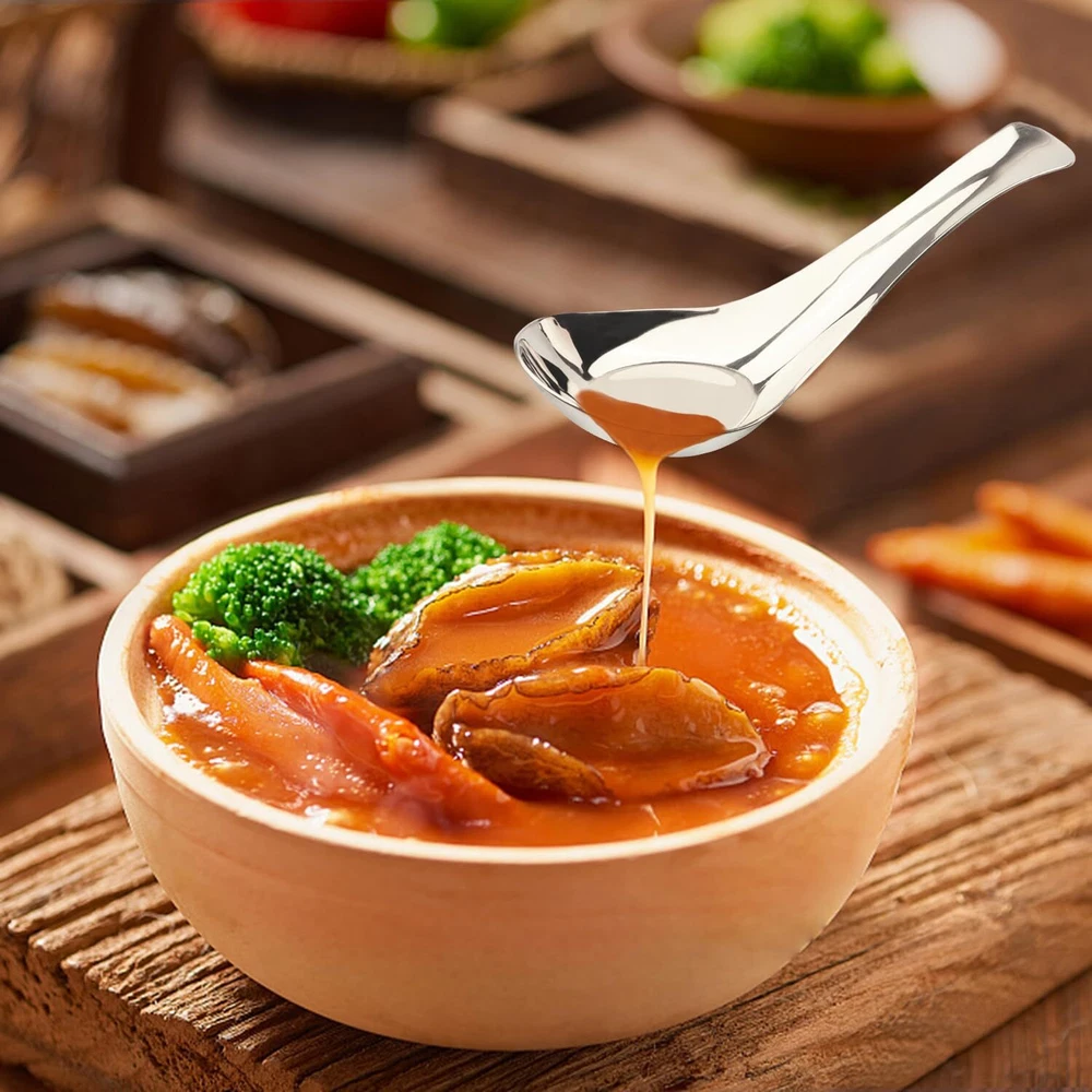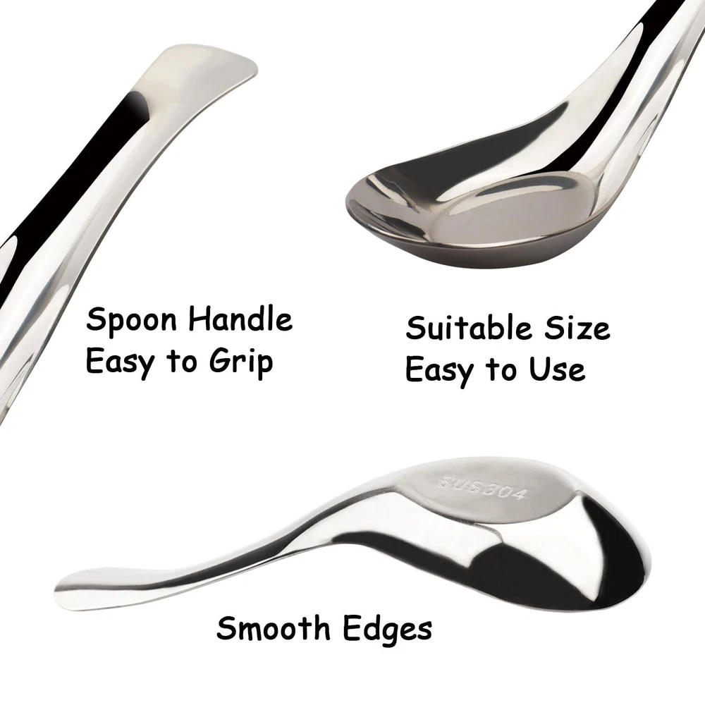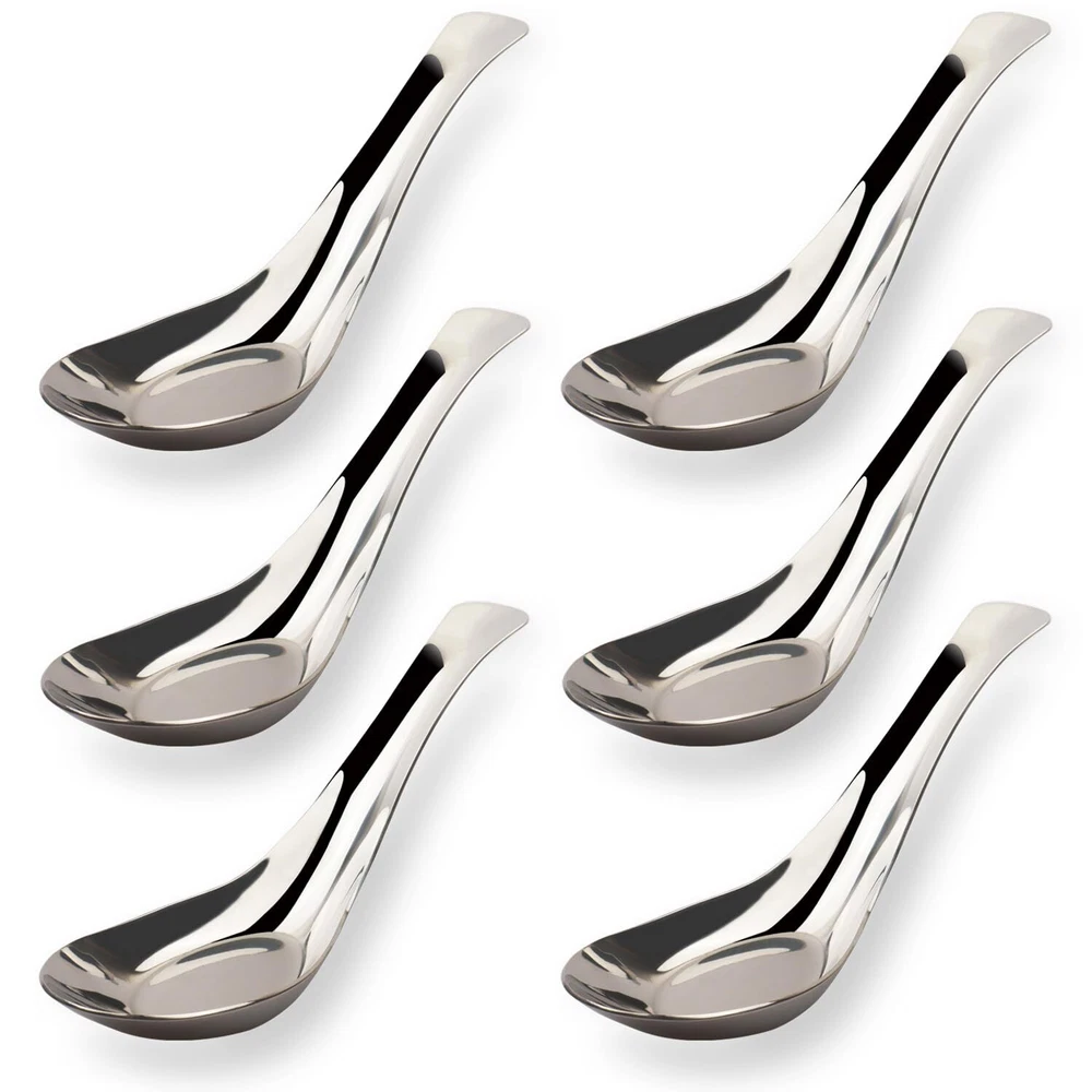 You will receive 6 pieces of soup spoons Perfect Size: measuring about 5.82 x 1.65 inches/ 14.8 x 4.2 cm, approx. 0.4 mm in thickness,perfect for family meals or dinner parties. Premium Quality: These chinese soup spoons made of high-quality thicken stainless steel,durable and resistant to rust and corrosion. Comfortable Grip The ergonomically-designed handle ensures a comfortable and firm grip, comfortable for you to pick and hold These wide spoon head is especially for ladling soup or ravioli, wontons dumpling and other large soup food. Of course, it also suitable for dips,desserts,cereal,stews,chicken/udon noodle,shrimp ramen and more. Perfect Size:you will receive 6 pieces of soup spoons, measuring about 5.82 x 1.65 inches/ 14.8 x 4.2 cm, approx. 0.4 mm in thickness,perfect for family meals or dinner parties. Premium Quality: These chinese soup spoons made of high-quality thicken stainless steel,durable and resistant to rust and corrosion,ensuring they last for years to come. Comfortable Grip: The ergonomically-designed handle ensures a comfortable and firm grip, comfortable for you to pick and hold, without scratching your hands.These wide spoon head is especially for ladling soup or ravioli, wontons dumpling and other large soup food. Of course, it also suitable for dips,desserts,cereal,stews,chicken/udon noodle,shrimp ramen and more. Easy to Clean: Smooth&polished surface of these soup spoons makes them easy to clean and maintain, also easy for you to clean with water or dishwasher,which can serve you for year.These kitchen spoons are stackable and easy to clean without bad smells or lingering odors after washing. Wide Applications: you can apply the Asian soup spoons for formal occasions, such as dinner banquets, festivals, weddings, parties, celebrations, family gatherings, restaurants and more, matching with your tableware, also nice gifts for sending to others.