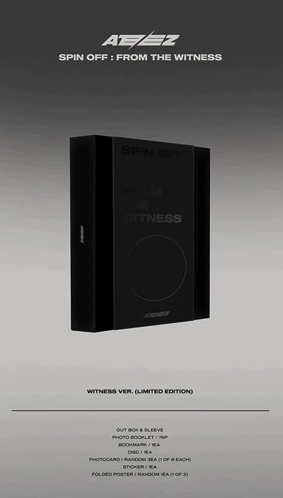 Further Details Title: Spin Off : From The Witness - Limited Witness Version - incl. Photo Booklet, Bookmark, 3 Photocards, Sticker + Folded Poster Condition: New Format: CD Artist: Ateez No Of Discs: 1 Record Label: Import EAN: 8809704425438 Description: Includes 76 page photobook + bookmark + random photocard + sticker + poster Missing Information? Please contact us if any details are missing and where possible we will add the information to our listing.