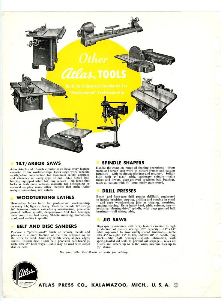 original 4-page brochure advertising Atlas model 5010 Belt & Disc Sander. Made by Atlas Press Company, Kalamazoo Mich. Not dated but probably c. late 1940's-50. It measures 8&1/2" x 11"" and is in very good condition. Will ship well protected in large envelope via USPS