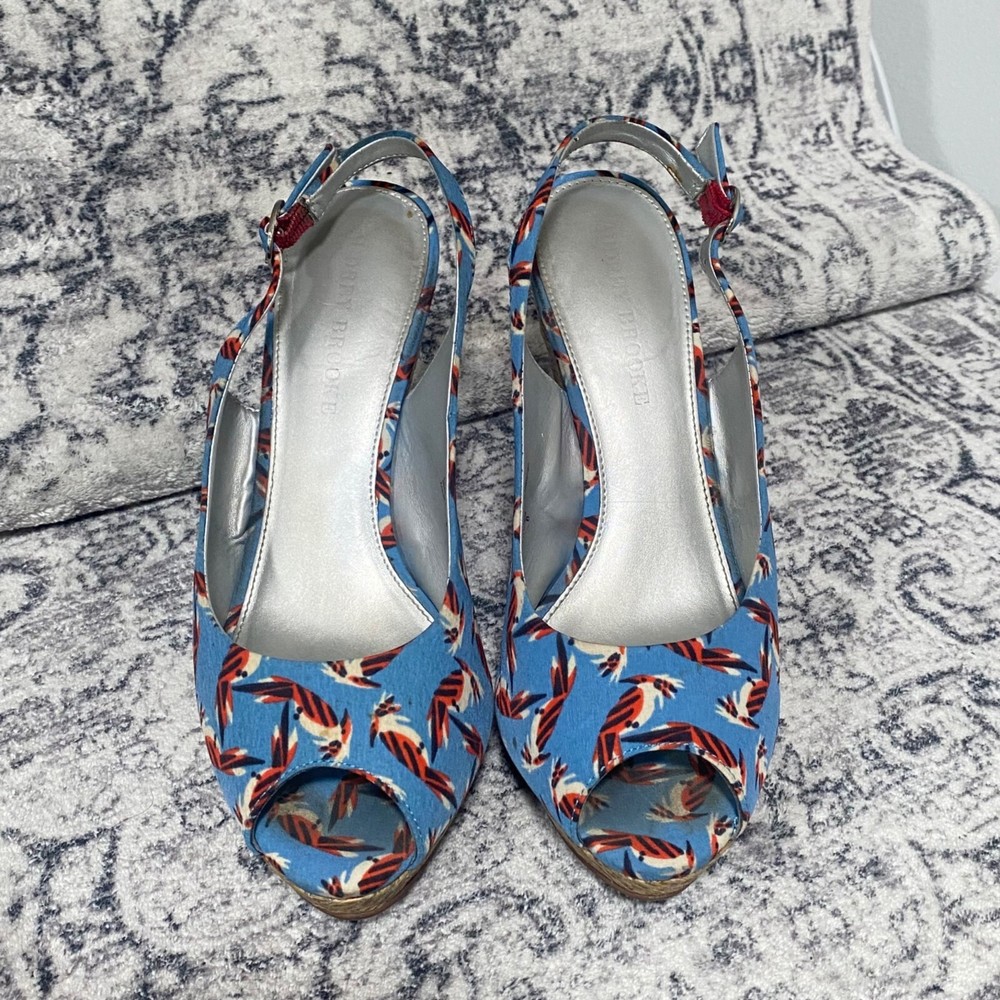 Audrey Brooke NAOMI Slingback Wedges in Blue Size 8, light blue background with red bird print, peep toe front, buckle closure, rattan wedge heel Heel Height - 4.5” - 5” Great condition No rips, tears, stains or damages See pics for more details & fabric content Fast shipping & pet/smoke free