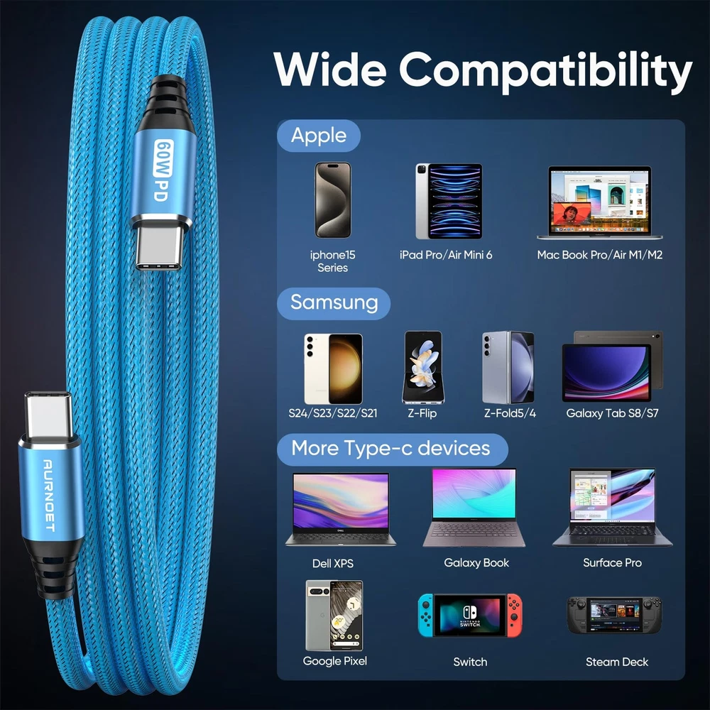 Aurnoet USB C to USB C Cable, 6FT 5-Pack Type C to Type C Charger Cable Fast Charging Cord 60W for iPhone 15/15 Pro/15 Plus/15 Pro Max, Samsung Galaxy S23 S22 S21 Ultra Aurnoet USB C to USB C Cable, 6FT 5-Pack Type C to Type C Charger Cable Fast Charging Cord 60W for MacBook Pro, iPhone 15/15 Pro/15 Plus/15 Pro Max, Samsung Galaxy S23 S22 S21 Ultra. Equipped with a USB-C to C type port support PD3.0/QC3.0/QC4.0 fast charging up to 60W Max (20V/3A), and data transfer speeds up to 480Mbps. 【High Speed Charging and Sync】Equipped with a USB-C to C type port support PD3.0/QC3.0/QC4.0 fast charging up to 60W Max (20V/3A), and data transfer speeds up to 480Mbps, compatible with iPhone 15 pro, Samsung,iPad Air Mini Pro, Macbook and More. 【Perfect Cable Length】5-Pack 6FT long cords can offer you more convenience on the car, sofa, library, office, and share with others. 【Durability Materials】Nylon braided USB cable with a strain relief design, reinforcing durability and tangle-free. Premium Aluminum housing ensures won't easily break. 【Wide Compatibility】The type c charger cable is Widely compatible with iPhone 15/15 Plus/15 Pro/15 Pro Max, MacBook Air/Pro, iPad Mini/Pro/Air, Samsung Galaxy S23 Ultra/S23+/S23/S22 Ultra/S22+/S22/S21 Ultra/S21+/S21/S20/ S20+/S20 Ultra/Note 20,Steam Deck and more devices with USB-C port. 【What you get】Package includes 5-pack 6ft USB-C to USB-C cable, we have 24/7 professional customer service. If you have any questions, we will solve them within 24 hours. Shipping from the USA All of our products are shipped from the USA, ensuring quick delivery to your destination. Payment We offer the following payment methods: PayPal, credit card, bank transfer, and eBay's secure payment system. Free Shipping & Free Returns Shipping within the USA is FREE. Additionally, any return is absolutely free for you. Risk-Free Purchase You have the option to return an item within 30 days without any justification. We cover the return shipping costs! Fast Shipping We ship immediately upon receipt of payment. Generally, the package is delivered within 2-3 days in the USA. If it takes longer, we will contact you. Quality and Costs Made in Europe, USA, China No customs fees or additional charges Total satisfaction guarantee Invoice with declared VAT available upon request in .pdf format Feedback Your feedback is very important to us. After you pay for your purchase, you will automatically receive positive feedback from us.