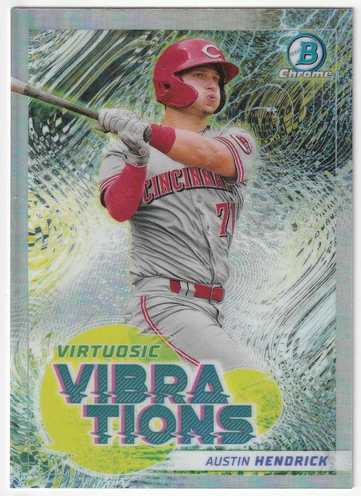 Austin Hendrick 2022 Bowman Chrome Virtuosic Vibrations #VV-9 Reds Prospect Two copies of this card are up for auction, both in excellent condition. This is auction B. Cards under $10 CAD will be shipped PWE with Canada Post letter mail. If you would like to upgrade to a bubble mailer please message me BEFORE sending payment so I can adjust the shipping charge. Cards over $10 CAD will be shipped in a bubble mailer with Canada Post oversized letter mail. U.S. and International shipping available. Combined shipping available. Shipping Pricing (listed in CAD): Canada: PWE: $1.50, Bubble: $3.00 USA: PWE: $2.25, Bubble: $5.00 International: PWE: $3.75, Bubble: $8.00 Combined Shipping: Add $1.00 for each additional card. All US and International shipments are subject to customs/duty charges.
