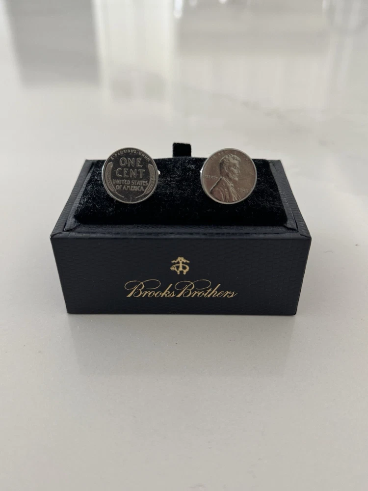These authentic silver cufflinks feature two 1943 pennies that have been transformed into a unique and stylish accessory. The cufflinks are engraved with intricate details and showcase the vintage coins in a round shape. Made by Brooks Brothers in the United States, these cufflinks are perfect for special occasions such as weddings, graduations, or Father's Day, adding a touch of history and charm to any outfit. Ideal for men who appreciate classic and meaningful accessories, these cufflinks are a timeless piece that combines style with a hint of nostalgia.