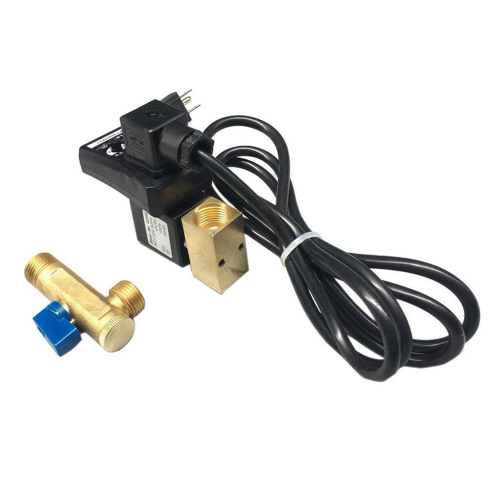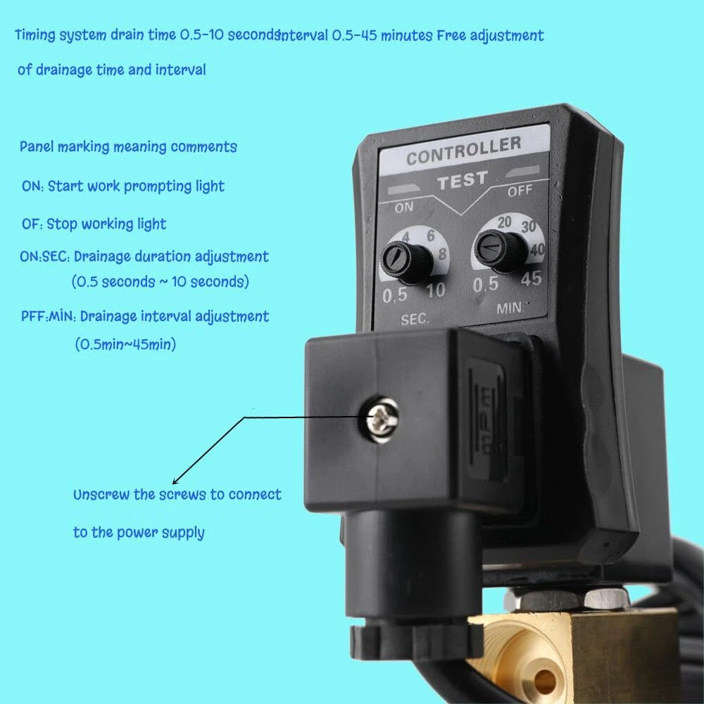 Type: two-way direct-acting valve. The current consumption: Max 4mA. Power supply voltage: AC 110V-120V/50Hz Air Compressor Tank Drain Valve.110 Volt Electronic Automatic Timer Moisture Drain for Air Compressors and Air Tanks. Time interval ( OFF ): 0.5--45 minutes (adjustable);Discharge time ( ON ): 0.5--10 seconds (adjustable). Equipped with a ball valve filter, split with drain valve, an L-shaped structure.