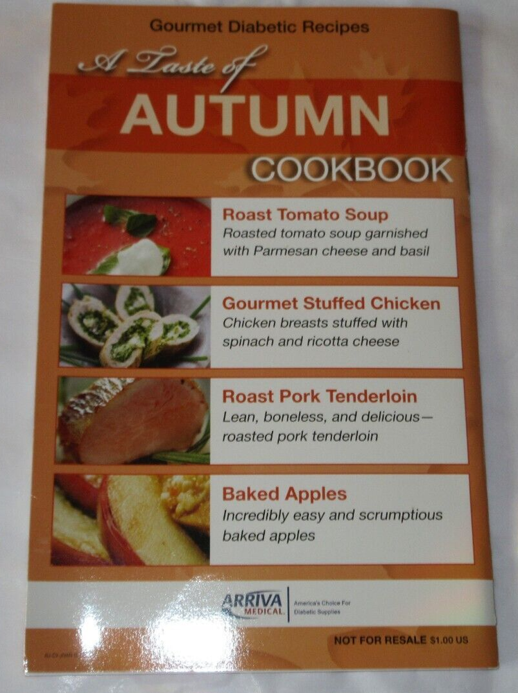 " A Taste of Autumn Cookbook" Published by Arriva Medical, paperback features gourmet dishes many illustrations includes appetizers to desserts, all diabetic-friendly.