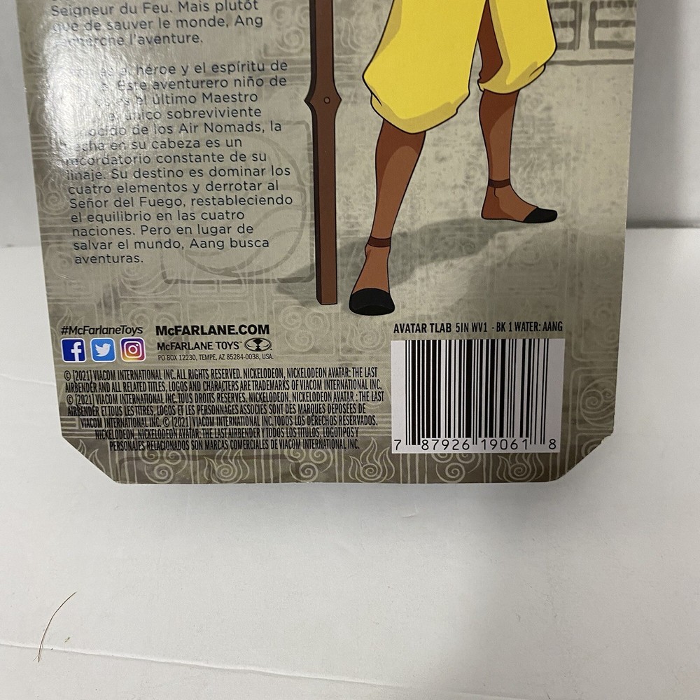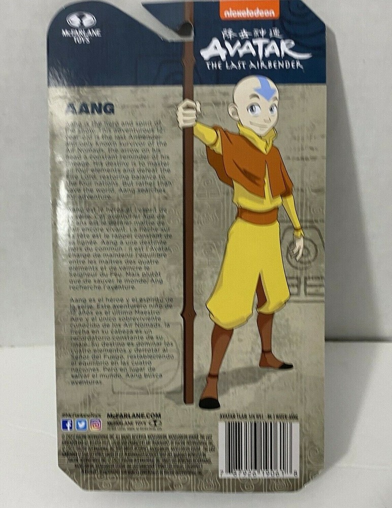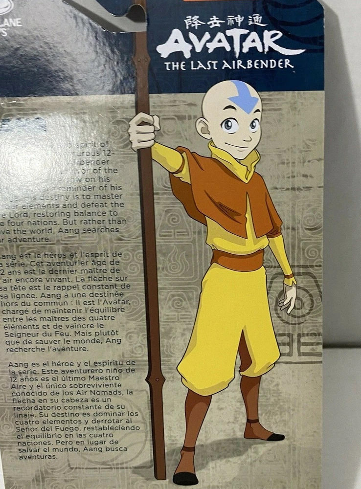 Nickelodeon Avatar The Last Airbender 5 1/2” McFarlane AANG Figure Aang is the hero and spirit of the show. This adventurous 12- year-old is the last Airbender and only known survivor of the Air Nomads, the arrow on his head a constant reminder of his lineage. His destiny is to learn the art of the Avatar and defeat the Fire Lord of the Fire Nation. But rather than save the world, Aang searches for adventure. He wants a life full of fun experiences, not heavy responsibilities. Aang believes people are either in harmony with the Spirit of the Planet, or corrupt and misled. Because Aang is the Avatar, he has a connection with nature as well as animals. If he’s lost, Aang is able to “listen” to the spirits of the trees, rivers, and mountains who “tell” him which way to go. He is a trickster hero uninhibited by social constraints, and constantly breaking taboos.