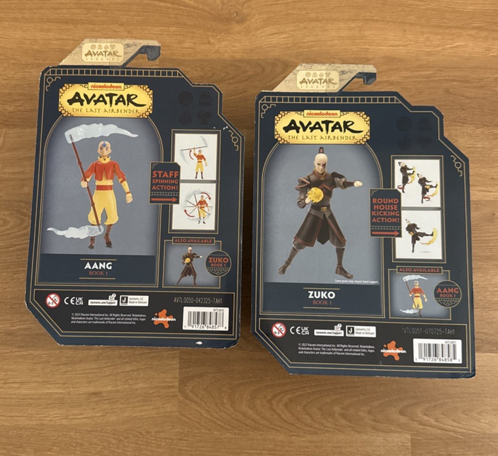 This is a sealed Avatar: The Last Airbender set featuring Aang and Zuko (Book 1 edition) from Jazwares. The set comes with bending‑effect accessories and is ideal for collectors or fans of the series. The figures are secure in their original packaging, and the set makes a strong display piece or addition to an Avatar collection! The set remains new and in unopened condition. The packaging displays some minimal shelf wear and some light corner wear. Please see photos for more details.