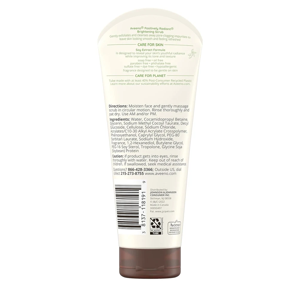 7-ounce tube of Aveeno Positively Radiant Skin Brightening & Exfoliating Daily Face Scrub cleanses & buffs away dead skin, surface impurities, & oil for softer, brighter skin. This scrub helps improve skin's tone & texture & reveals radiant-looking skin The unique formula of this brightening facial exfoliant scrub contains moisture-rich soy extract & naturally derived granules designed to gently exfoliate & cleanse, while removing dirt, oil, & bacteria Gentle enough for everyday use & sensitive skin, the daily exfoliating face wash reveals your skin's youthful texture & glow while helping even tone From a dermatologist recommended brand, this scrub is soap-free, oil-free, paraben-free, phthalate-free, sulfate-free, dye-free & hypoallergenic. Suitable for everyday use in a beauty or skincare routine, & is non-comedogenic so it won't clog pores The Aveeno Positively Radiant collection is designed to enhance your natural radiance & give you a lit-from-within glow. With Soy extract, this product targets skin tone & texture to reveal radiant-looking, smooth, youthful, & healthy-looking skin Gently buff away surface impurities, dead skin & oil for softer, brighter, more even-toned skin with Aveeno Positively Radiant Skin Brightening & Exfoliating Daily Face Scrub. It gently exfoliates skin & helps improve skin's tone & texture & reveals radiant-looking skin. This scrub leaves skin looking smooth & feeling refreshed & makes skin feel silky after 1 day. The soap-free & oil-free formula combines moisture-rich soy extract with naturally derived granules to exfoliate & cleanse away dirt, oil, & bacteria. This cleanser is hypoallergenic, non-comedogenic & gentle enough for sensitive skin & everyday use in a regular beauty or skincare routine. From a dermatologist recommended skin care brand, the Positively Radiant collection is designed to help improve skin tone & texture & reveal radiant-looking skin to give you a lit-from-within glow. With soy extract, it targets skin tone & texture. To use, moisten face & gently massage scrub in circular motion. Rinse thoroughly & pat dry.