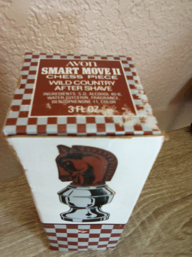 The Avon Vintage Smart Moves Oland Cologne in the original box is a large, glossy brown glass bottle shaped like a chess piece, specifically a knight. Handmade in the 1970s in the United States, this collectible item comes in its original packaging and is perfect for all occasions. The unique design and vintage appeal make it a standout piece for any room or collector's display, showcasing the craftsmanship and style of Avon from that era. box is open bottle is full