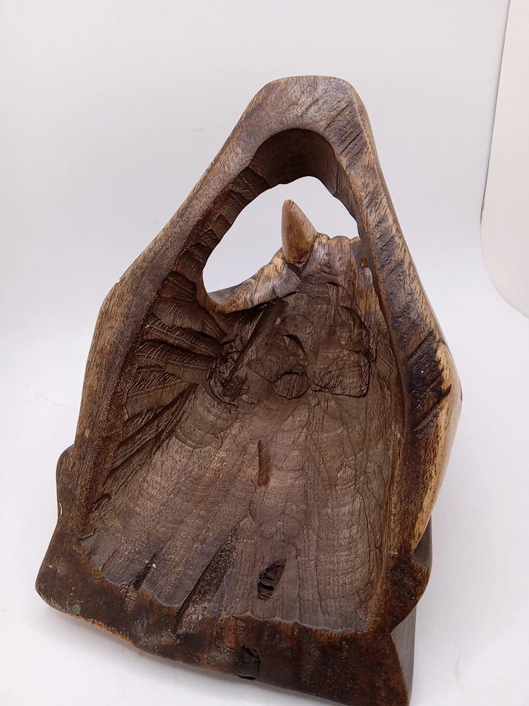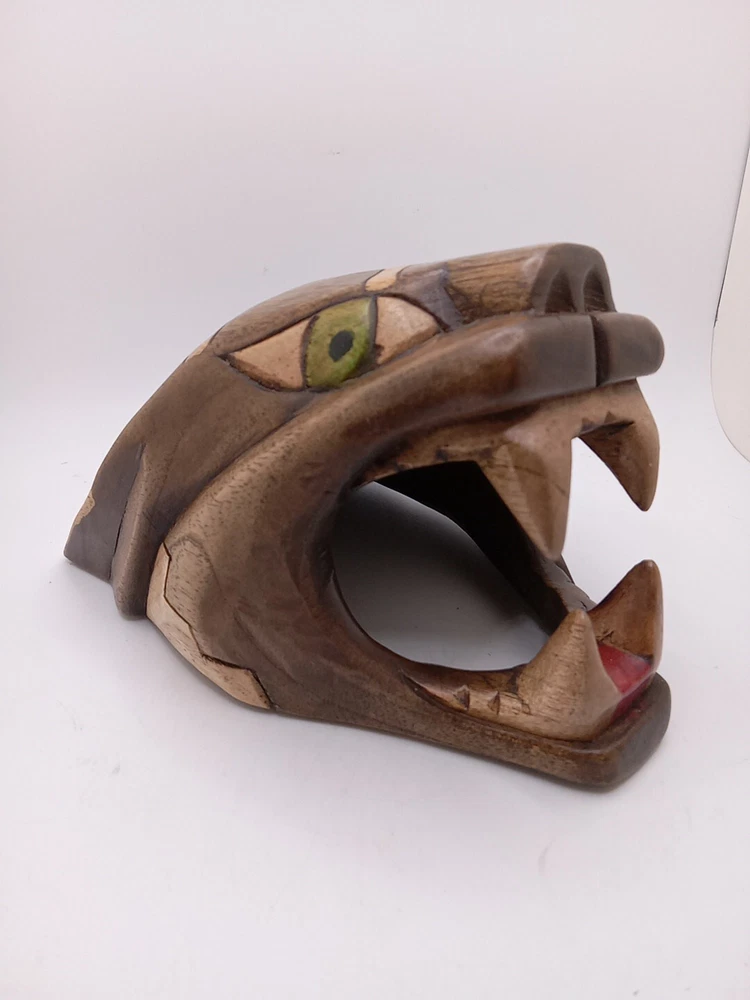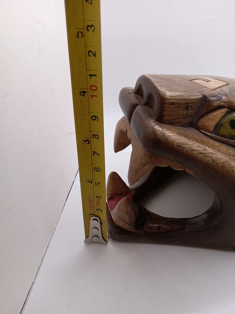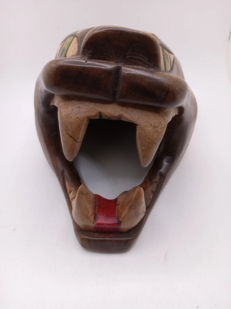 This stunning Aztec/Mayan MCM hand-carved jaguar head is a one-of-a-kind piece of Latin American folk art. The intricate details of the jaguar head are a testament to the skilled artisans who created it. The piece is perfect for collectors of Latin American culture and artifacts. The jaguar head is a symbol of strength, power, and protection in the Aztec and Mayan cultures. This piece is a unique and cool addition to any collection or home décor. Its authenticity and quality are guaranteed. Add a touch of Latin American heritage to your collection with this beautiful piece. Please see my other auctions for my other thrift store finds.