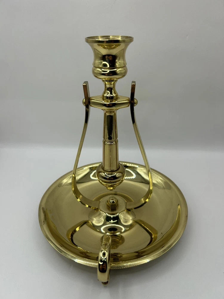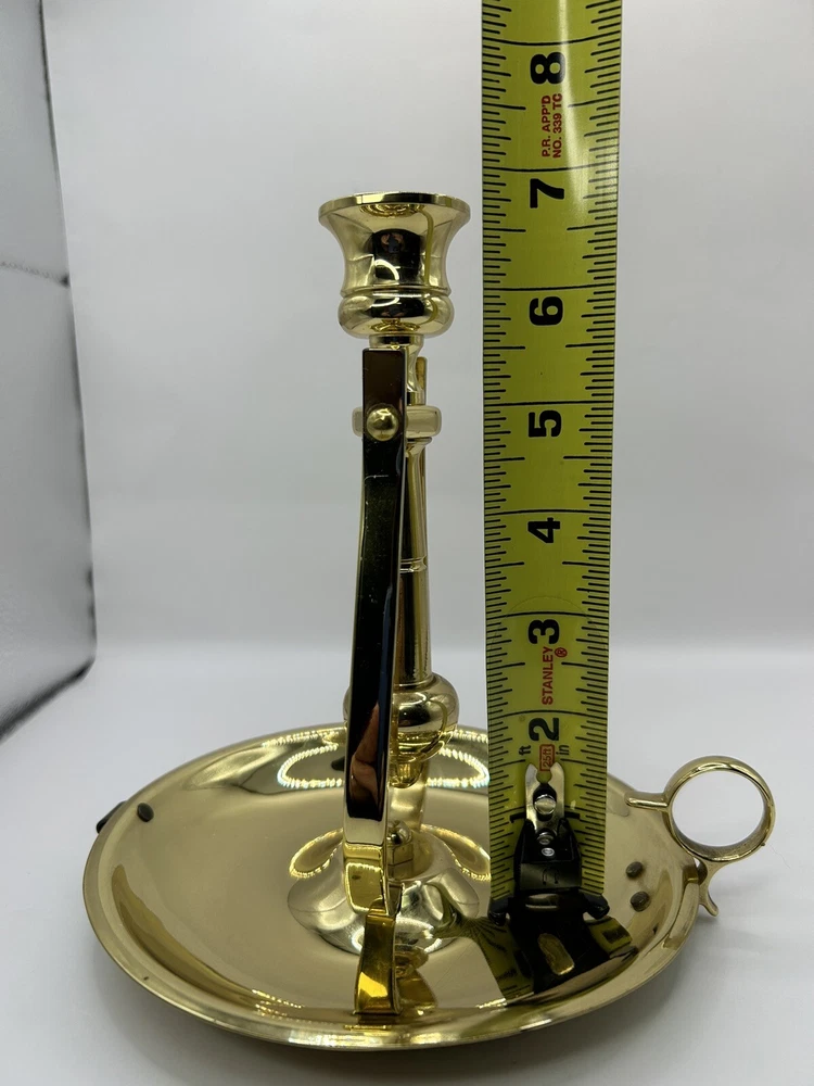 This is previously used and has some blemishes / scratches due to usage. No breaks or cracks. Add a touch of elegance to your home decor with this stunning BALDWIN Brass Chamberstick Candlestick. Crafted in the United States, this original piece features a polished brass finish and a nautical design that adds a unique charm to any room. The candlestick is medium-sized, measuring 7 inches in height and 6-1/8 inches in width, with a weight of 1lb 2oz. This beautiful candle holder is perfect for any occasion and is sure to create a warm, cozy atmosphere in your home. It features a hanging and swinging design that adds a touch of sophistication to your decor. The BALDWIN Brass Chamberstick Candlestick is a must-have for collectors and is an excellent addition to any decorative collection.