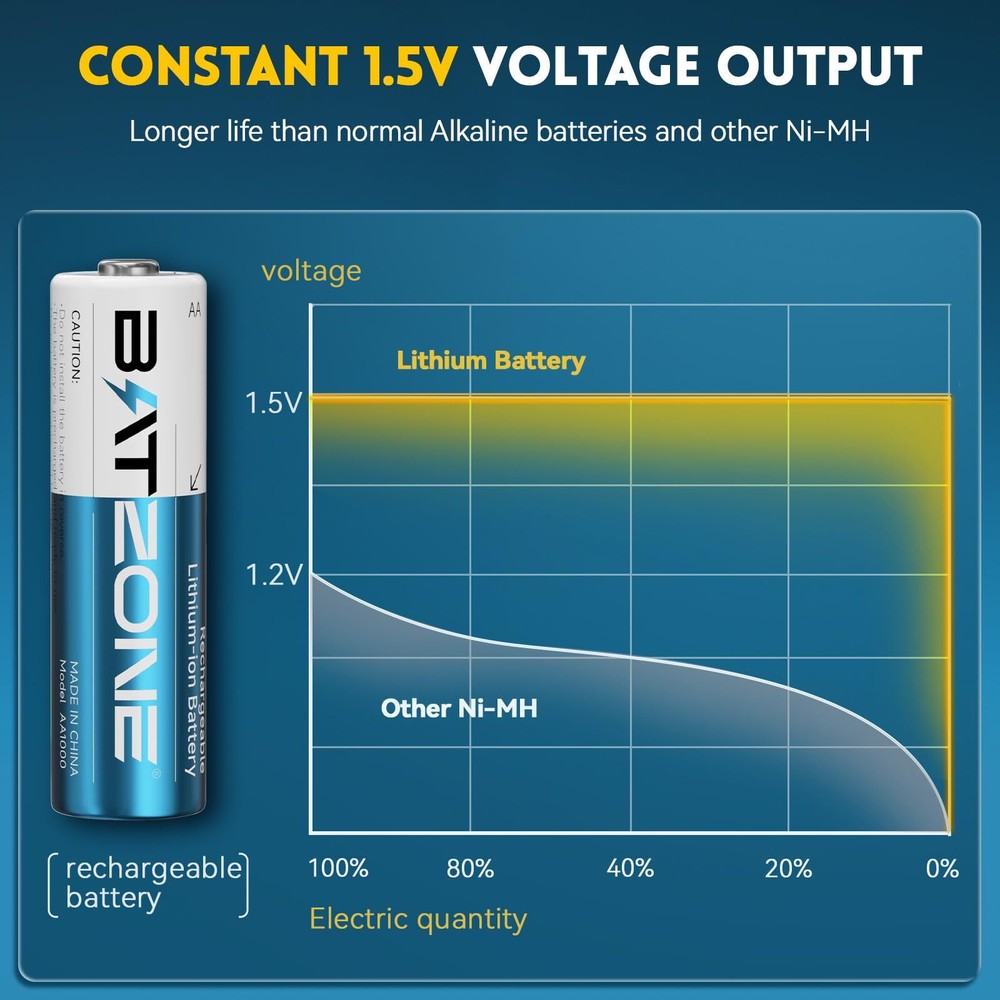 These BATZONE lithium AA batteries are fantastic! They last way longer than regular rechargeables, and the constant 1.5V output keeps devices running strong. I love that they come with a fast charger and can be recharged up to 1600 times—great value for money. No memory effect means I can recharge anytime without losing capacity. Perfect for high-drain gadgets! Highly recommended.