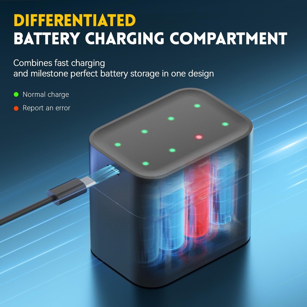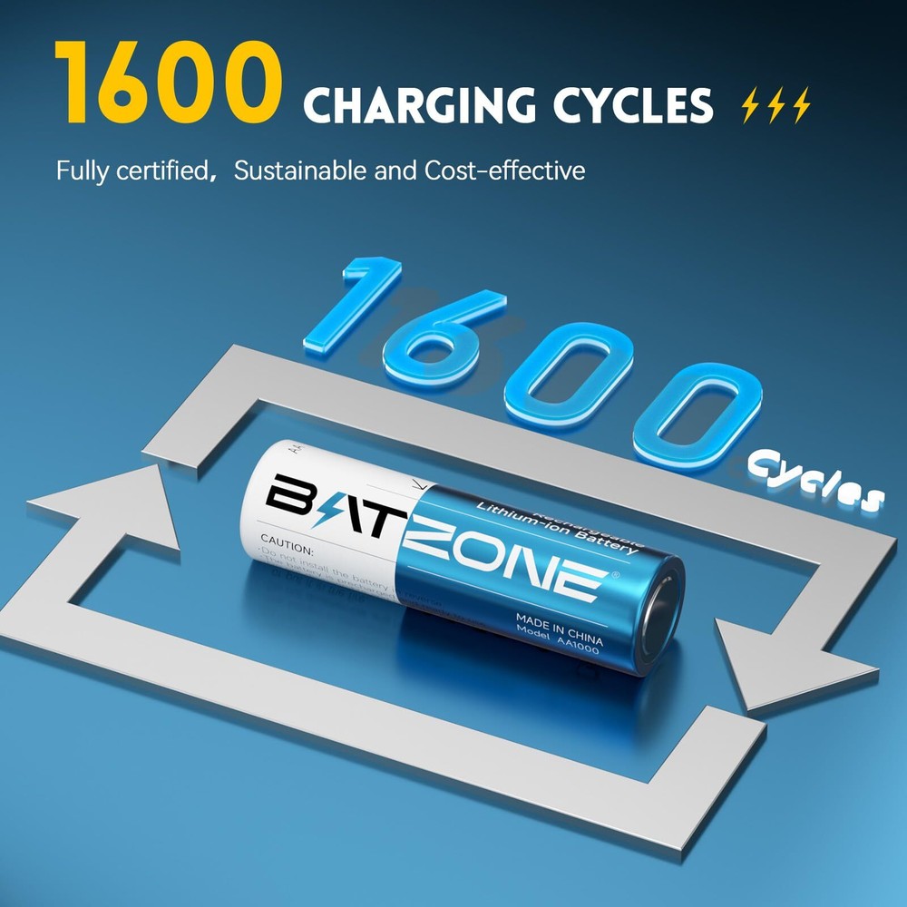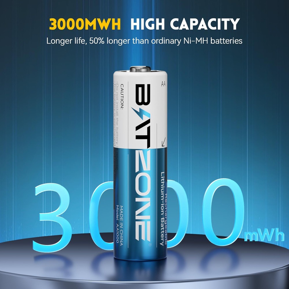 【Ultra-high Capacity and 1.5v Voltage Output】BATZONE rechargeable lithium aa batteries with a high capacity of 3000mWh and higher energy density,which allows for a high number of charge/discharge cycles and a long lifespan.Constant output of 1.5V for the entire process until the power is completely depleted, keeping your device in top condition at all times. 【1600 Times Long Cycle Life】With no memory effect and a very low self-discharge rate, our double a rechargeable lithium batteries have more than 1600 rechargeable cycles, which can save you a lot of money.Overall, rechargeable Lithium AA batteries are a convenient power source,providing a reliable and long-lasting energy supply for everyday use. 【Integrated Charging and Storage】With 8 independent charging slots, the lithium battery charger adopts a magnetic design, allowing the battery charging and storage as one, making the battery storage and carrying more convenient, supporting 1-8 AA lithium batteries in any combination of charging. 【2.5H Fast Charging Technology】2.5 hours quick charge for 1-8pcs aa lithium batteries, reduce your waiting time.Type-C charging port is suitable for all kinds of interface input, you could use a laptop, car charger,power bank,adapters etc. to charge the battery,make the charging more flexible.(Recommended: 5V/3A) 【A Popular Choice for Portable Electronics】BATZONE rechargeable lithium aa batteries with charger feature 3000mWh and 1.5V constant voltage output, ideal for high power consumption devices,such as Gamepad, VR Grip, Doorbell, Camera, Flash, Door Lock, Microphone, Radio, Children's Toys, Alarm Clock, Scale, Blood Pressure Monitor and so on.(Also Suitable for blink camera )