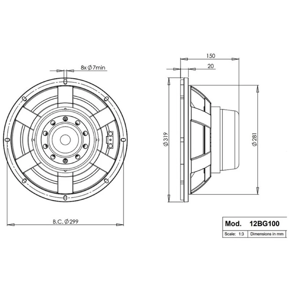 B&C Speakers 12BG100-4 12-inch Bass Woofer LF Drivers Pro Audio Component Speaker Driver for Motorcycle Car with 4 Ohms Impedance 1000 Watts Rms 2000 Watts Max Neodymium Continuous power handling: 2000 W. * Voice coil diameter: 4.0 in (100 mm) * Magnet material: Neodymium Inside Slug. * Nominal Diameter: 320 mm (12.0 in). * Nominal Impedance: 4 Ohms. * Minimum Impedance: 5 Ohms. * Nominal Power Handling: 1000 W. * Continuous power handling: 2000 W." Sensitivity (1W/1m): 93.0 dB. * Frequency Range: 40 - 1000 Hz. * Voice Coil Diameter: 100 mm (4.0 in). * Winding Material: Copper. * Former Material: Glass Fibre. * Winding Depth: 27.0 mm (1.05 in). * Magnetic Gap Depth: 11.0 mm (0.43 in). * Flux Density: 1.15 TDesign. * Surround Shape: Roll. * Cone Shape: Radial. * Magnet Material: Neodymium Inside Slug. * Spider: Double Silicone. * Pole Design: T-Pole." Woofer Cone Treatment: TWP Waterproof Both Sides. * Recommended Enclosure: 40.0 dm3 (1.41 ft3). * Recommended Tuning: 40 Hz * Resonance Frequency: 39 Hz." Overall Diameter: 319 mm (12.5 in). * Bolt Circle Diameter: 299 mm (11.8 in). * Baffle Cutout Diameter: 281.0 mm (11.1 in). * Depth: 137 mm (5.4 in). * Flange and Gasket Thickness: 13 mm (0.5 in). * Air Volume Occupied by Driver: 2.7 dm3 (0.09 ft3). * Net Weight: 8.2 kg (18.0 lb). * Shipping Units: 1. * Shipping Weight: 9.1 kg (20.06 lb). * Shipping Box: 360x360x200 mm (14.17x14.17x7.87 in) * Recone kit: RCK12BG1008" B&C Speakers has been one of largest and most prestigious professional loudspeaker transducer manufacturers in the world. In addition to designing and distributing components under the B&C brand name, they also supply OEM components to many of the top professional audio brands in the market today.