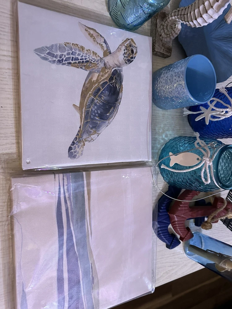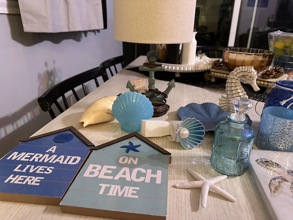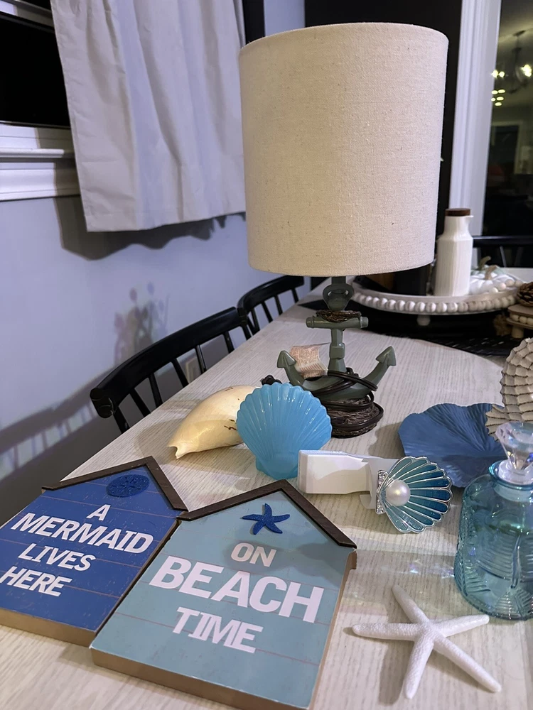 Includes 19 pieces: - [ ] One Anchor Lamp - [ ] 2 Sign Plaques (one says a mermaid lives here the second one says on beach time) - [ ] one Decor shell - [ ] one Blue Shell Light - [ ] one Bath and body works shell wall plug (used) - [ ] one Blue wall plaque - [ ] one Seahorse Decor Figurine - [ ] One Turtle Small Wall Art (New in Package) does have a small hole on bottom right corner - [ ] One Wave Small Wall Art - [ ] one Mini decor starfish - [ ] one Message in a bottle glass decor - [ ] one Blue candle holder - [ ] Two candle holders (one with fish, second one with starfish rope) - [ ] 2 decorative bottles - [ ] 2 Anchor Wall Decor