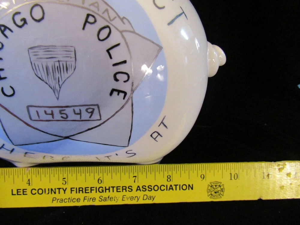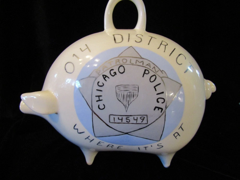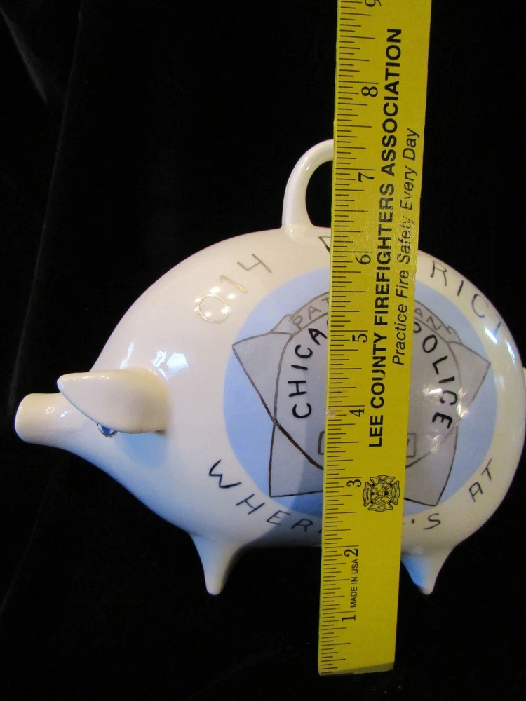 BIG VINTAGE PIGGY BANK "CHICAGO POLICE" 014 DISTRICT CHICAGO POLICE 14549 "WHERE IT'S AT" This is a great looking piggy bank that will hold plenty of coins. Nice vintage logo with Big ring at the top No chips or scratches. Measures 8" tall x 10" long x 5" wide