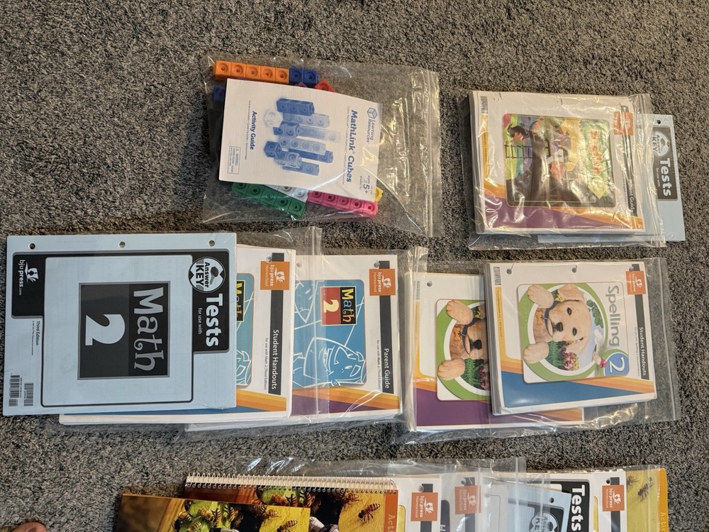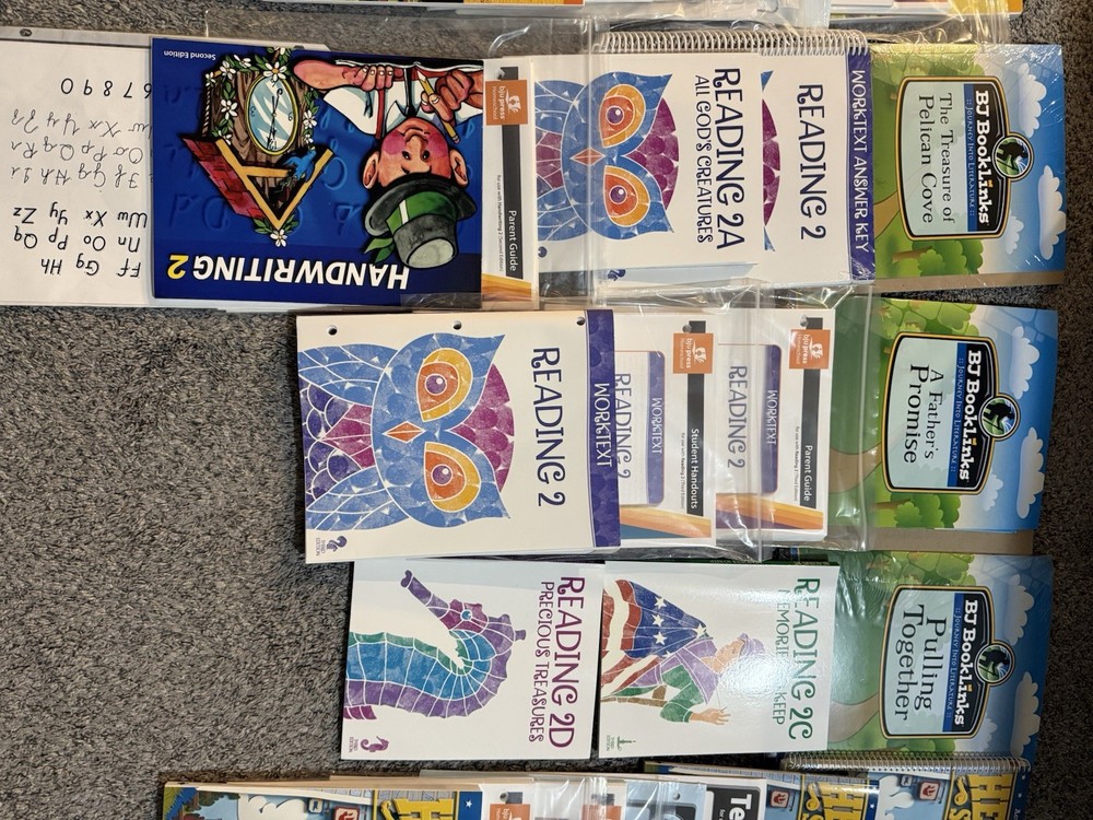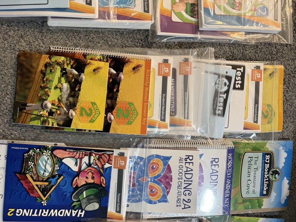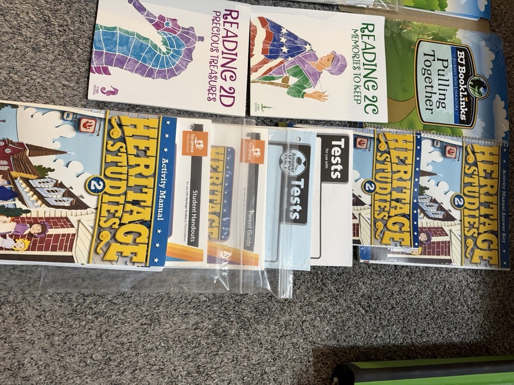 Almost like new. Some top pages of the paper packets show signs of being stored in a binder. But none of those binders were used more than a few times. Some of the work texts have pages filled in only to page 10. Please look closely at the photos to see exactly what pieces are included. Reading heritage studies and science are the subjects with the most items included. Some others will need additional parts of the set. This will get give u a great start!