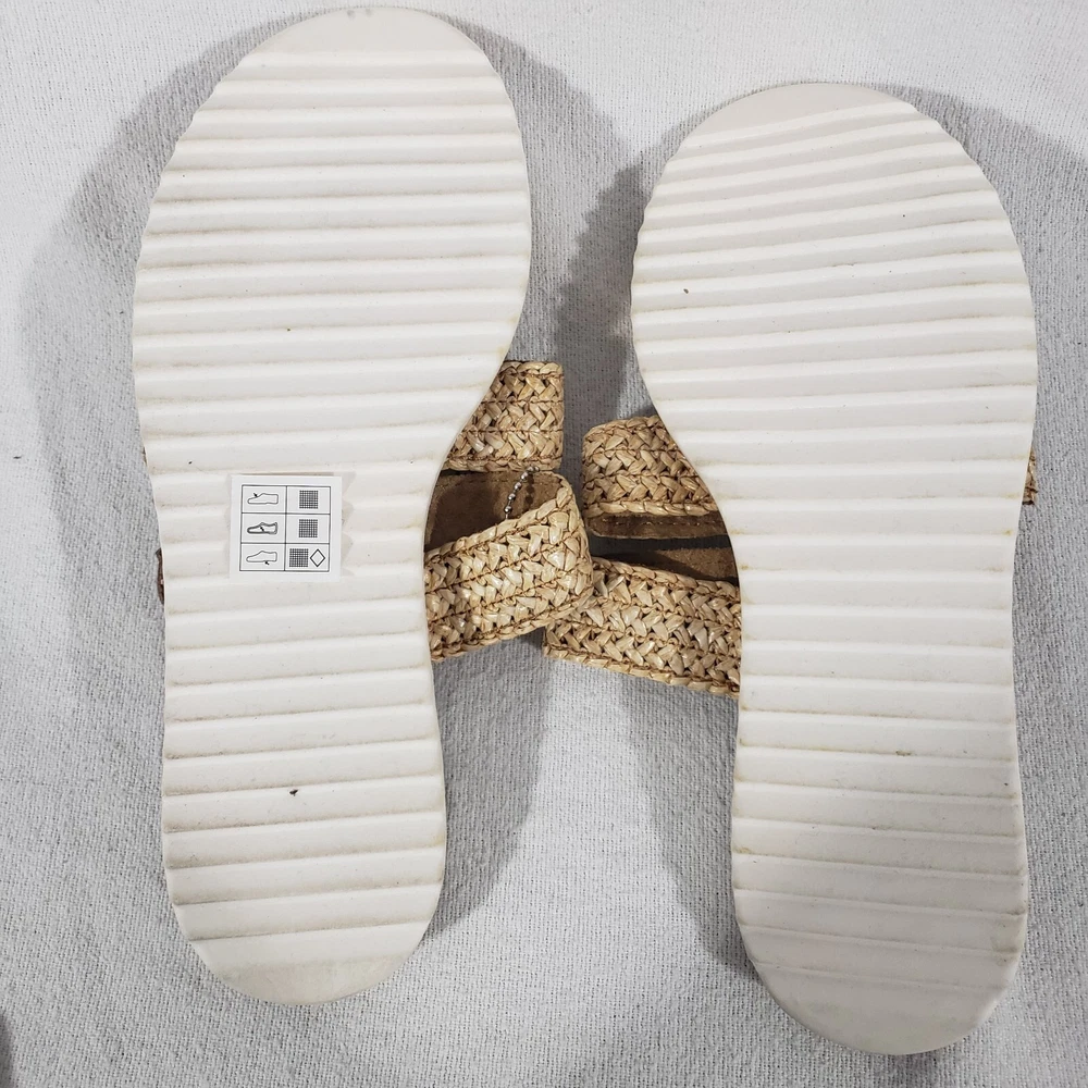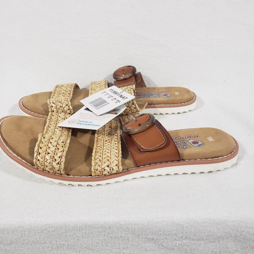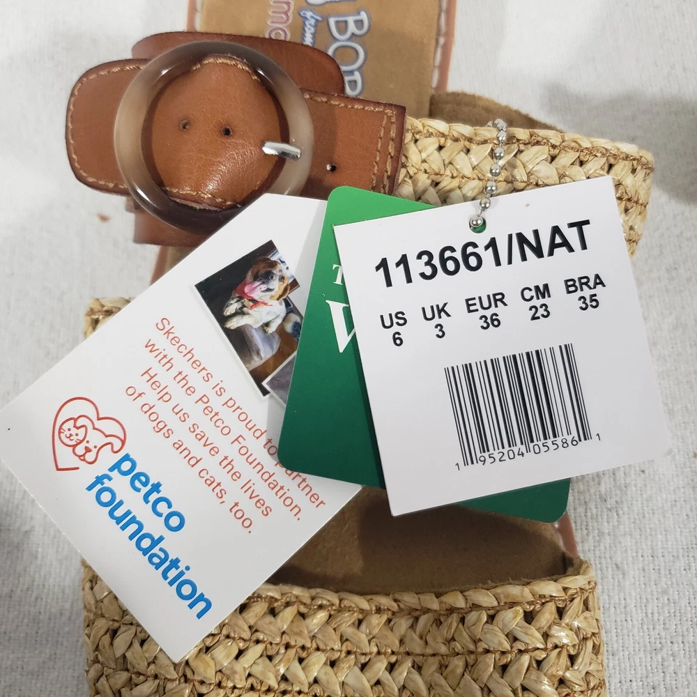 Bobs from Skechers womens slip on flat sandals Size 6 Tan, white Man made materials Rattan straw straps Buckles Open round toe Memory foam comfort Casual, travel, vacation, summer, beach, poolside, cruise New without box, with tags **Offers are welcome **Ship within 1-2 days **Smoke free environment