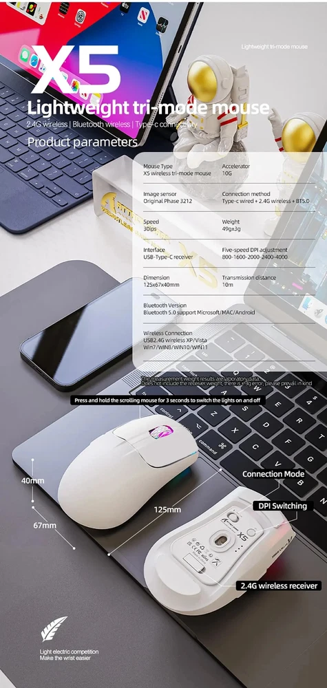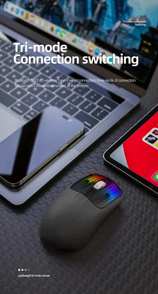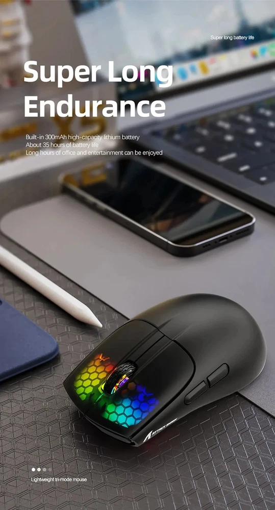 • 3 Modes for Versatile Use : The mouse comes with 3 different modes, BT/2.4Ghz/USB-C, allowing you to use it wirelessly or with a cable. • RGB Lighting for Enhanced Gaming Experience : The mouse features RGB lighting that adds a touch of style to your gaming setup and enhances your gaming experience. • Rechargeable Battery for Convenience : The mouse has a rechargeable battery, eliminating the need for frequent battery replacements and ensuring convenience. • Optical Sensor for Accurate Tracking : The mouse uses an optical sensor, providing accurate tracking of movements and ensuring precise control over your gaming or work activities. 【3 Mode Bluetooth Wireless Mouse】This gaming mouse wireless adopts advanced 2.4G wireless and Bluetooth 5.1 transmission technology and USB-C transmission. Computer mouse adopts Pixart 3212 Optical Sensor which Transmission frequency up to 2480MHz and refresh rate up to 4000FPS.compatible with your PC/Laptop/Macbook/Mobile Phones. 【Lightweight 49±3g RGB Honeycomb Design】The wired mouse is made of high quality Lightweight ABS material and designed with ergonomic shape, reduce the weight and make the mouse more flexible and easier to be used for a long time without fatigue. 【Breathing RGB Rainbow Backlight】The ATTACK SHARK mouse wireless has beautiful led rainbow backlit which is honeycomb shape on the right keys and left keys.You never expect the backlight of a mouse to be set up like this, it's incredible. You will definitely be attracted by this design. 【5 DPI Adjustable & Battery Rechargeable】This rechargeable gaming mouse can be adjusted within 5 levels dpi (4000-2400-1600-1200-800) by pressing the DPI button;Built-in 300Mah lithium battery,with USB-C charging cable, Low battery indicator will remind you to charge it with flashing red light.it also supported recharged while charging, not afraid of power off in gaming. 【Wide Compability Gaming Mouse】This Black gaming mouse is equipped with high quality switch,can be clicked up to 4 million times, can be used for PC, Mac Notebook, Laptop,Tablet, desktop, Computer, Cell Phone and other device, and support Windows 7/8/10/XP//VISTA/MAC OS/Android/ios, etc, The USB interface is plug and play Notice: 1. Please charge the product before first use 2. Please do not disassemble the product without permission 3. Do not use fast charging charger to charge the product