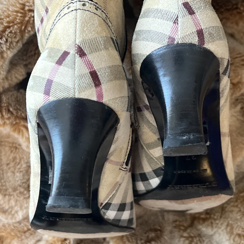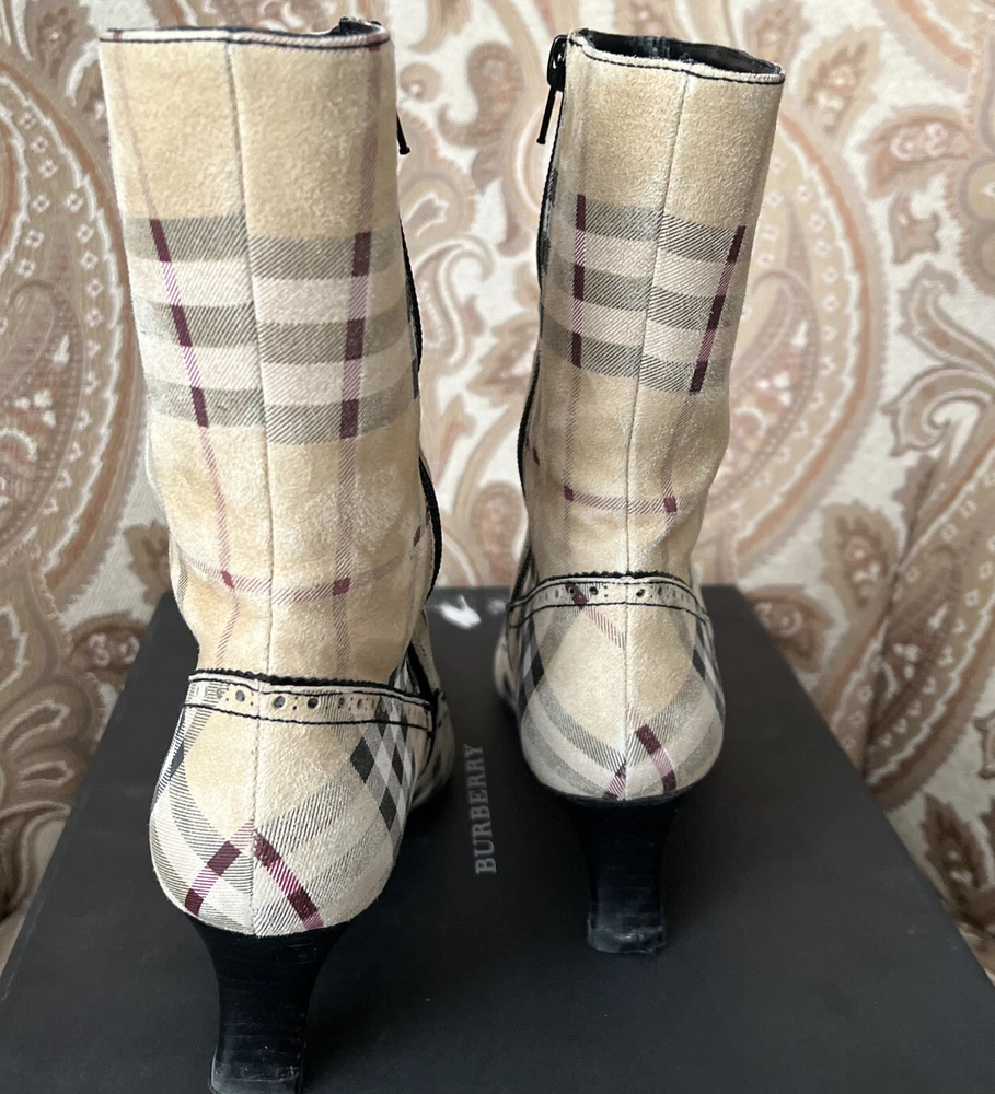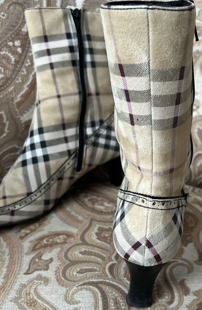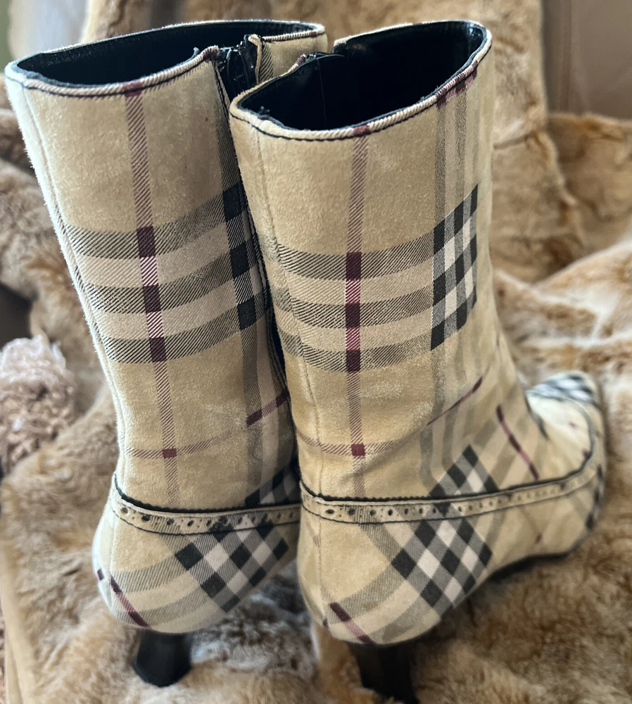 RARE BURBERRY Nova Check Suede, Kitten Heeled Boots Womans Size 37, US Size. These gently loved Burberry house check boots are from our personal collection and smoke free home. Zippers in perfect condition. Soles have a little wear. Burberry nova check suede exterior and leather interior. Kitten heals and cute detailing! Size 37 = US size 7 runs narrow and runs small. Please see photos as they are part of the description.