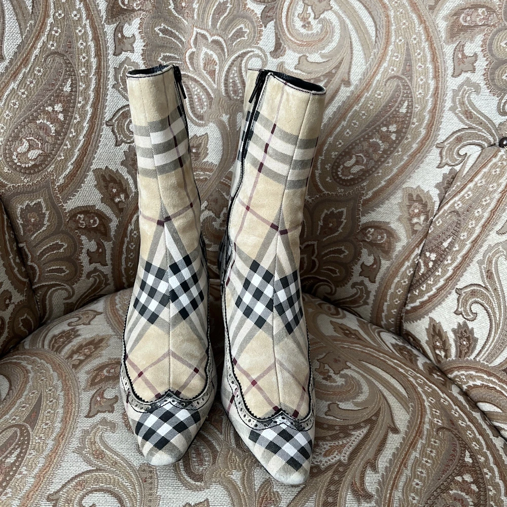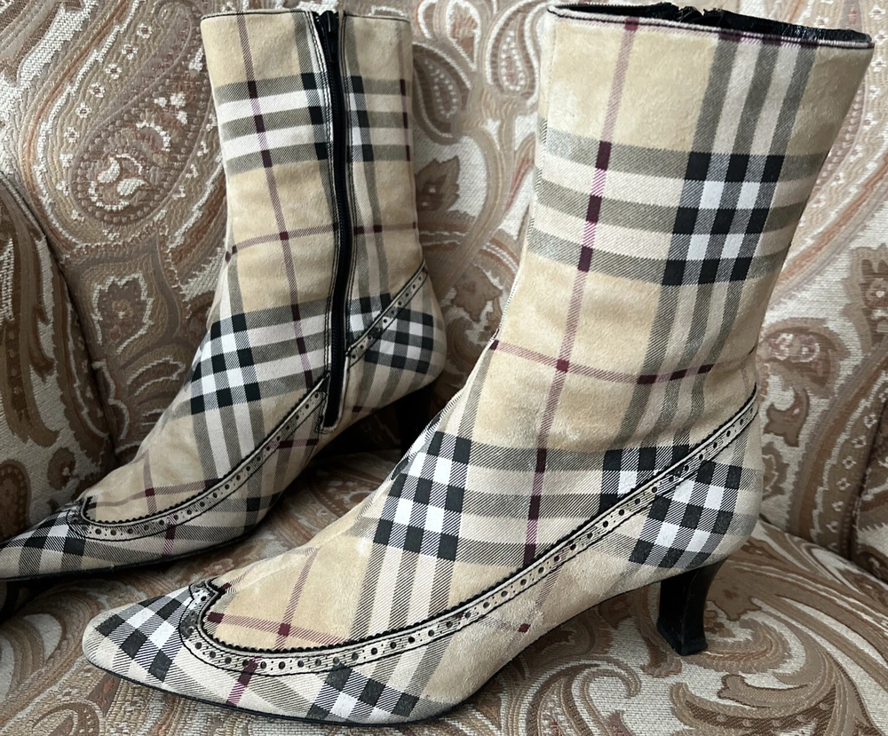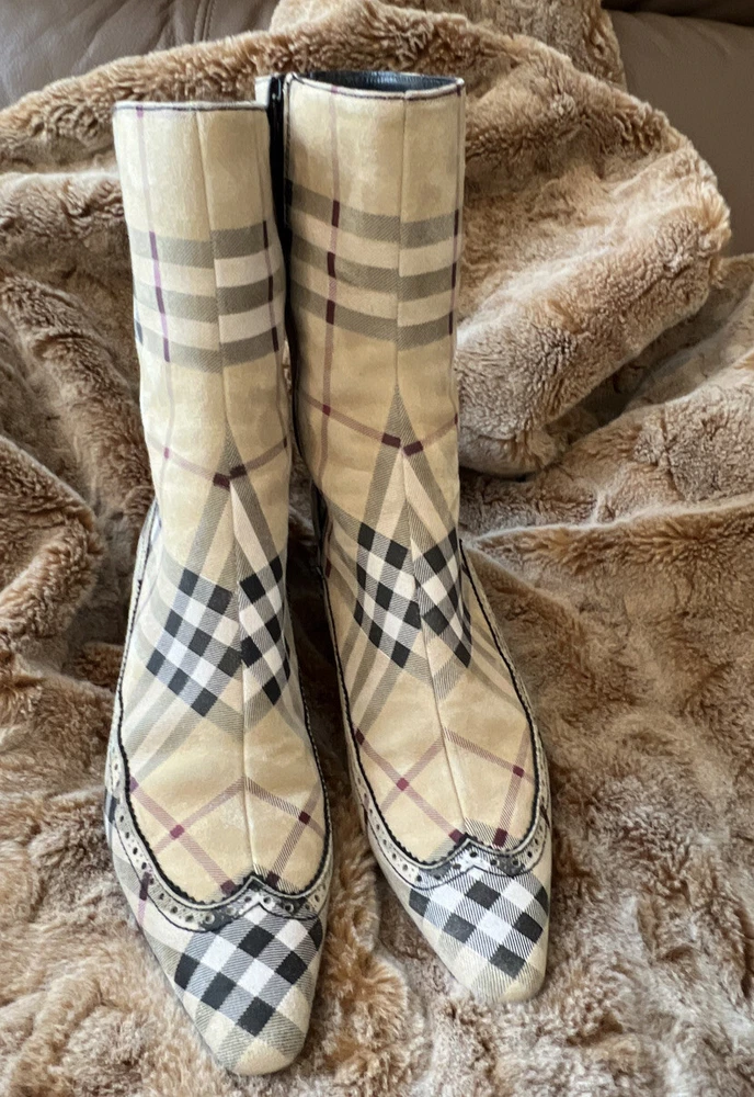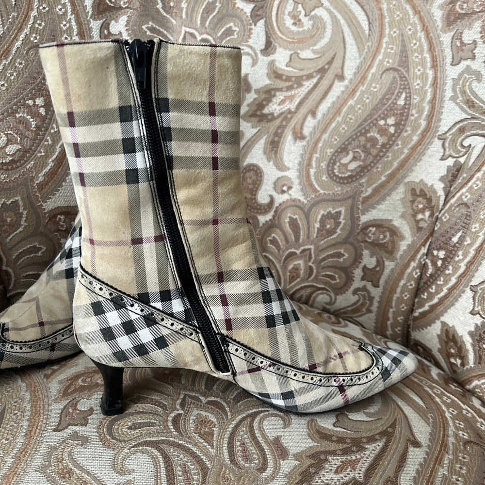 RARE BURBERRY Nova Check Suede, Kitten Heeled Boots Womans Size 37, US Size. These gently loved Burberry house check boots are from our personal collection and smoke free home. Zippers in perfect condition. Soles have a little wear. Burberry nova check suede exterior and leather interior. Kitten heals and cute detailing! Size 37 = US size 7 runs narrow and runs small. Please see photos as they are part of the description.