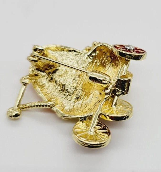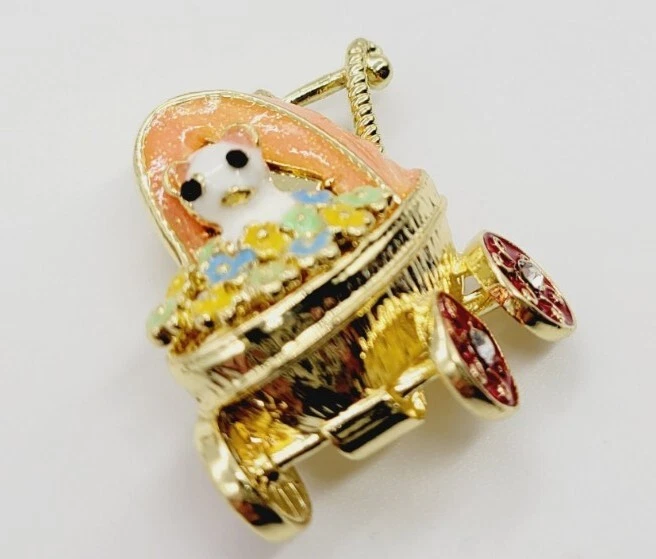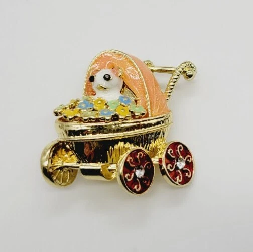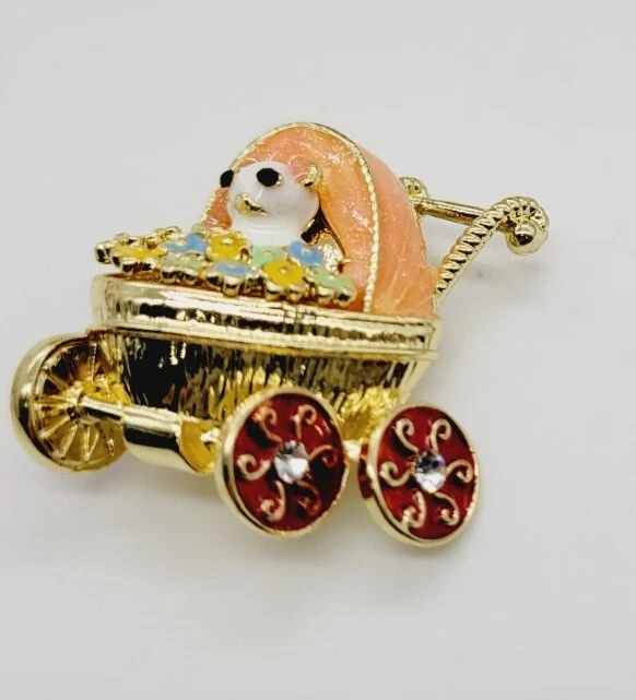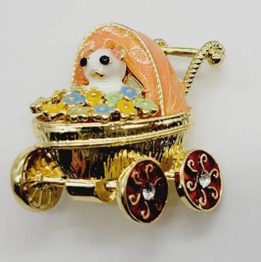Baby Stroller Carriage Brooch Pin Enamel Floral Flower Baby Animal Adorable