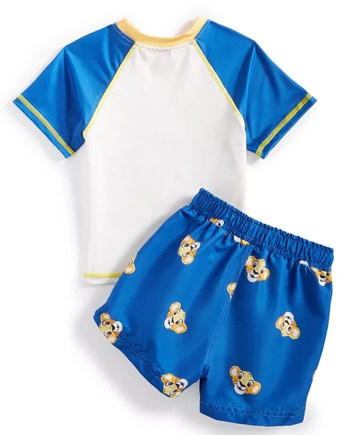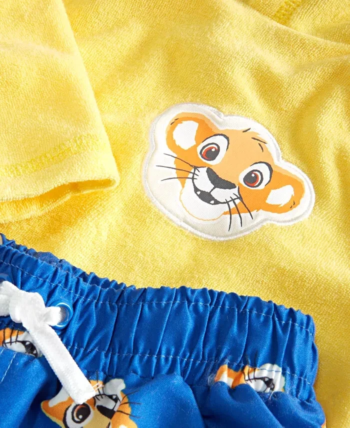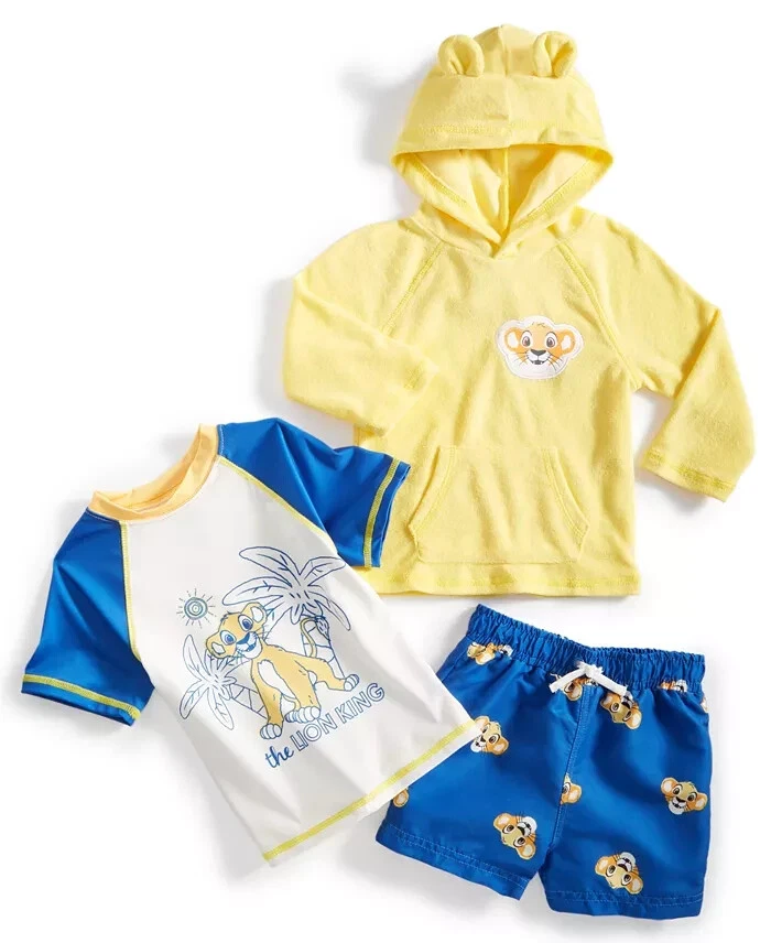 Disney Baby The Lion King 3-Pc. Printed Swim T-Shirt, Trunks & Hooded Cover-Up Set Get baby ready for the beach with this perfectly cute set from Disney, featuring a sporty swim tee, comfy swim trunks and a cozy hooded cover-up finished with graphics of Simba from The Lion King. Product Features +50 SPF technology Swim trunks: pull-on with drawstring and elastic waistband; Simba face-print pattern Imported T-shirt: crewneck; short raglan sleeves; colorblocked styling; The Lion King graphic print at front Set includes: 1 swim T-shirt, 1 pair of swim trunks and 1 swim cover-up Materials & Care Machine wash T-shirt and cover-up: cotton, polyester; swim trunks: polyester Check out our other listings for combined shipping and thanks for looking! **Veteran Preference Female Owned Business**