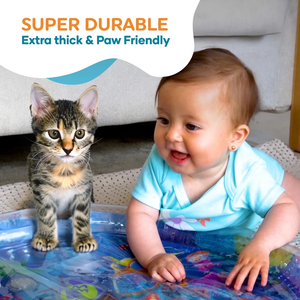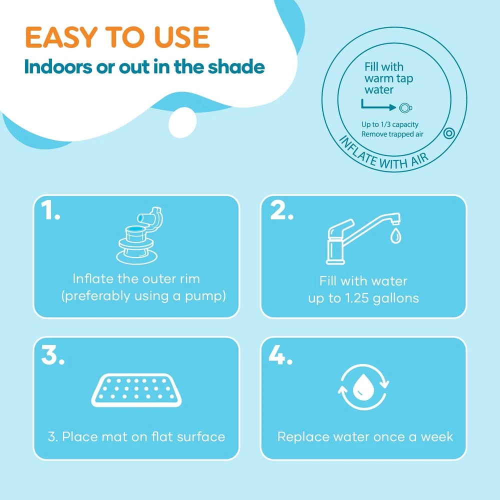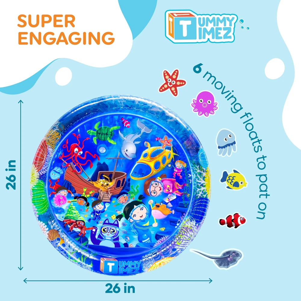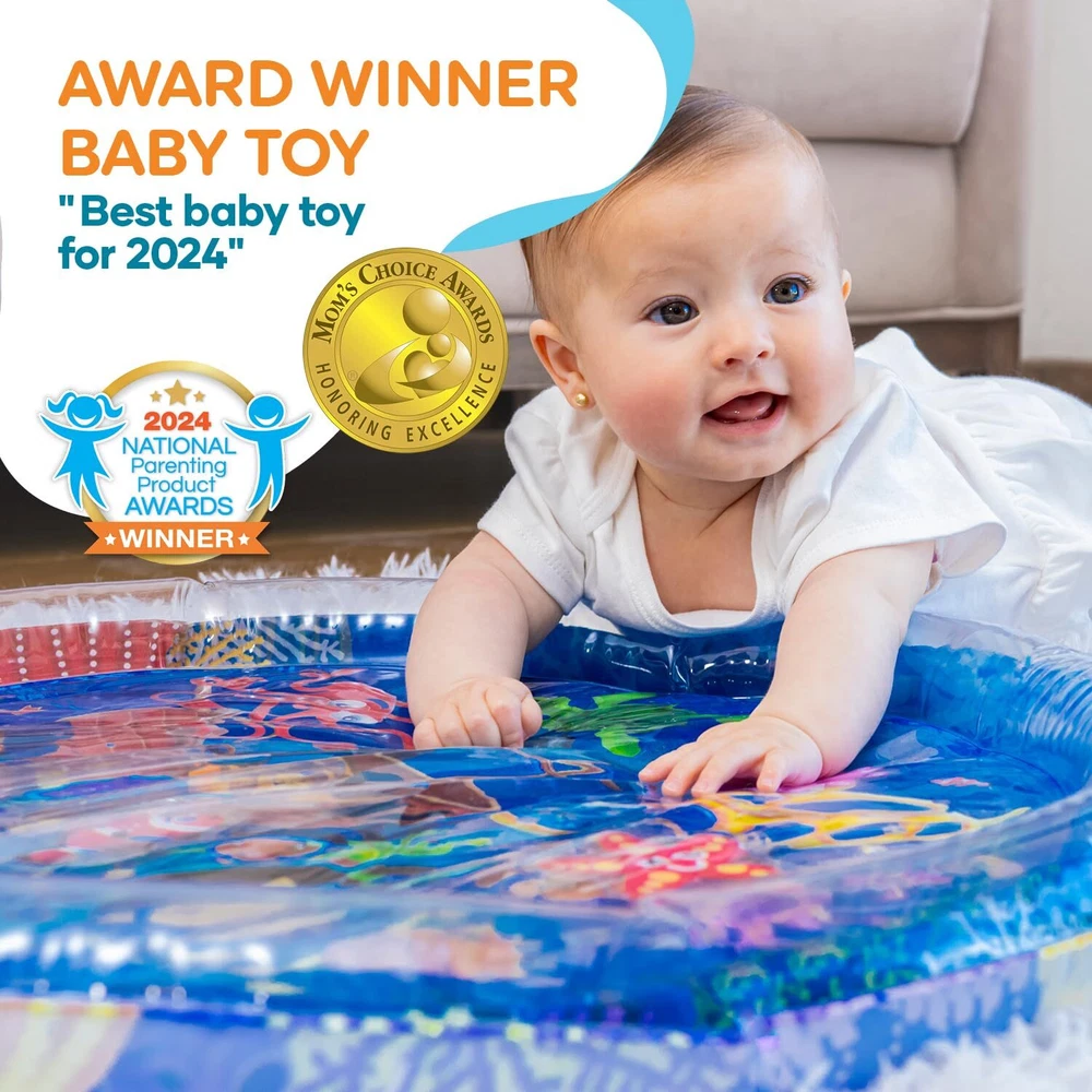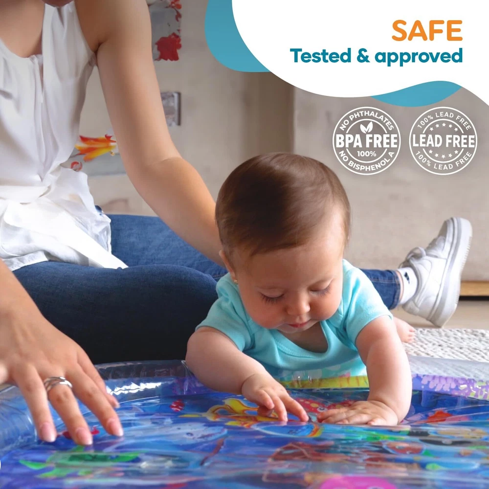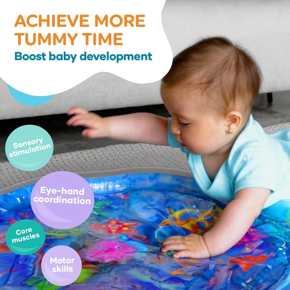 Tummy Time Water Mat BOOST BABY DEVELOPMENT - baby water mat is the ultimate tummy time motivator for 3 months and older babies and toddlers. Every detail, from the size of the inflated rim to the vibrant high contrast graphics, was carefully designed to create the right supportive environment to help your baby through the challenges of tummy time. A positive, interesting and less stressful experience will pave the way for tummy time success ACHIEVE MORE TUMMY TIME - Our activity mat’s vibrant color scheme was specially designed to prolong baby attention span for tummy time; For your baby it’s just a fun and interesting way to explore and play; For you it’s an effective way to achieve longer tummy time sessions and boost motor and sensory development GROW THROUGH PLAY - Doctors agree that tummy time activity is crucial for your baby’s healthy motor and sensory development, as it builds foundations for rolling, crawling, sitting and walking. The vibrant underwater scenery and water movement will fascinate your baby and make tummy time fun and easy PLAY SAFELY - As parents, we know the safety of your kids and the quality of their toys is your top priority. Our tummy time baby gym promises uncompromised safety standards– made of durable top quality PVC, CPC Certified, ASTM Approved, Lead Free, Phthalates Free and BPA free EASY TO USE - Simply inflate the outer rim with air and fill the central part with your desired level of warm tap water. Our sensory playmat pad can fold easily into any bag (when empty) and can be used indoors or out in the shade when placed on a safe & flat surface HERE FOR YOU - We promise top standards of service. If for any reason you are not satisfied with your purchase, please reach out to our customer care and we’ll be happy to make things right