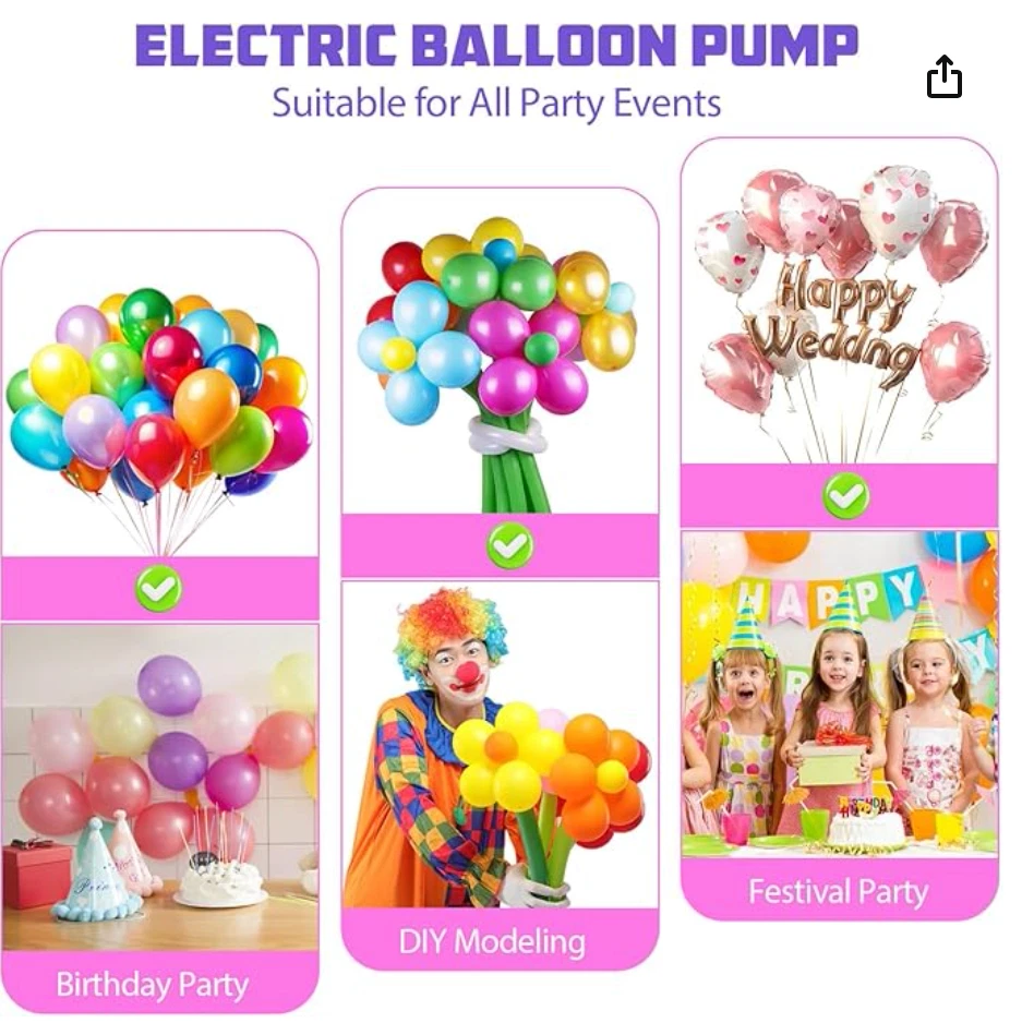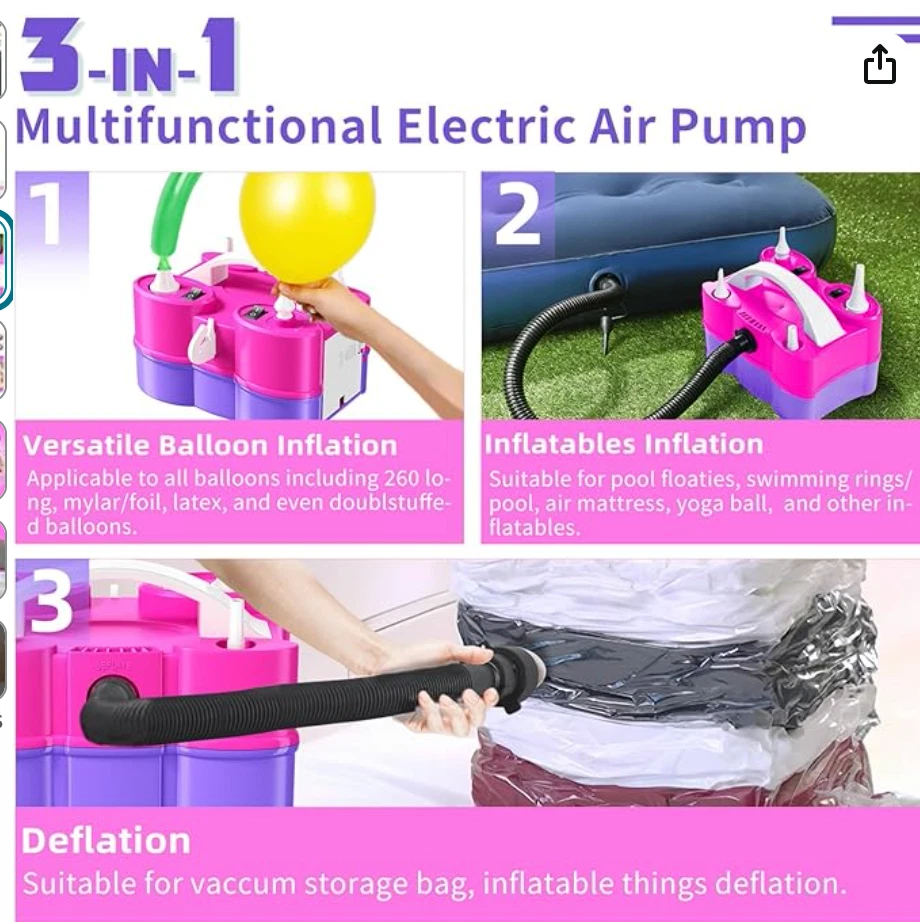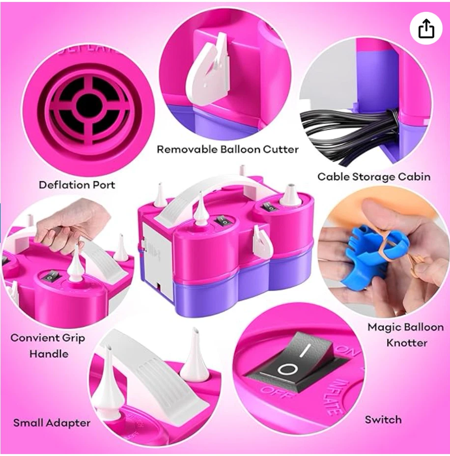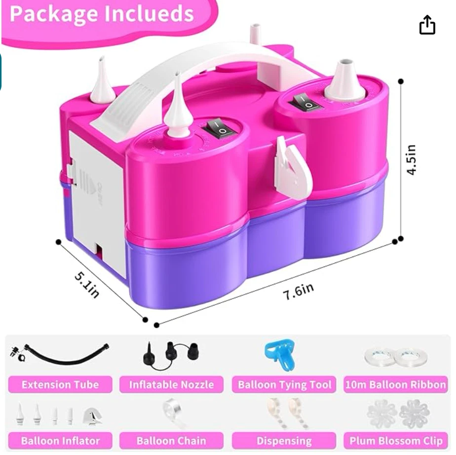 3-IN-1 Electric Air Pump - Streamline your party preparations and daily tasks with this powerful and versatile tool. The upgraded air pump is reliable, easy to use, and efficient, designed to meet all your needs. It functions as a balloon inflator, an inflation/deflation pump for inflatables, and a vacuum pump for storage bags. With its multifunctional design, it is an essential tool for home use, parties, and travel. Balloon Pump for All Balloons - Featuring two separate motors, this purple and pink electric balloon pump comes with two distinct inflation ports. One port efficiently inflates standard latex balloons, while the other is tailored for 260Q long balloons, foil balloons, double-stuffed, and smaller balloons. Offering both manual and automatic operation, the push-down mode ensures controlled inflation to prevent bursting, while the continuous mode is perfect for inflating multiple balloons quickly. Super Fast Inflation & Deflation - Experience powerful, high-speed inflation and deflation with ease. This electric machine pump inflates two balloons in just 3 seconds, deflates vacuum storage bags in 30 seconds, and inflates large pool floaties in just 5 minutes. Equipped with anti-slip pads for stability, ensuring a smooth and fast balloon setup for any event. Ideal for making balloon arch garland. Great for Christmas, Halloween, wedding, birthday baby shower and other celebrations. 5 Nozzles for Multi-Purpose Use - Equipped with five versatile nozzles, this balloon inflator pump is perfect for a wide range of inflatables. Ideal for inflating inflatable boats, rafts, air mattresses, pool floaties, yoga balls, vacuum storage bags, and more! The lightweight and compact design, combined with an easy-grip handle, a balloon cutter, ensures convenient on-the-go use, making it ideal for travel or on-site event setups. Kind Tips - Ensure that the ventilation holes are unobstructed during use and avoid operating in a closed or high temperature environment. If the pump overheats, stop using it immediately and allow it to cool completely before resuming use. For safe operation, avoid using the balloon blower near water or flammable materials. Please be aware that this pump ONLY fills balloons with AIR - NOT HELIUM or HYDROGEN. The balloons will NOT float. CHOKING HAZARD – Children under 8 yrs. can choke or suffocate on uninflated or broken balloons. Adult supervision required. Keep uninflated balloons from children. Discard broken balloons at once