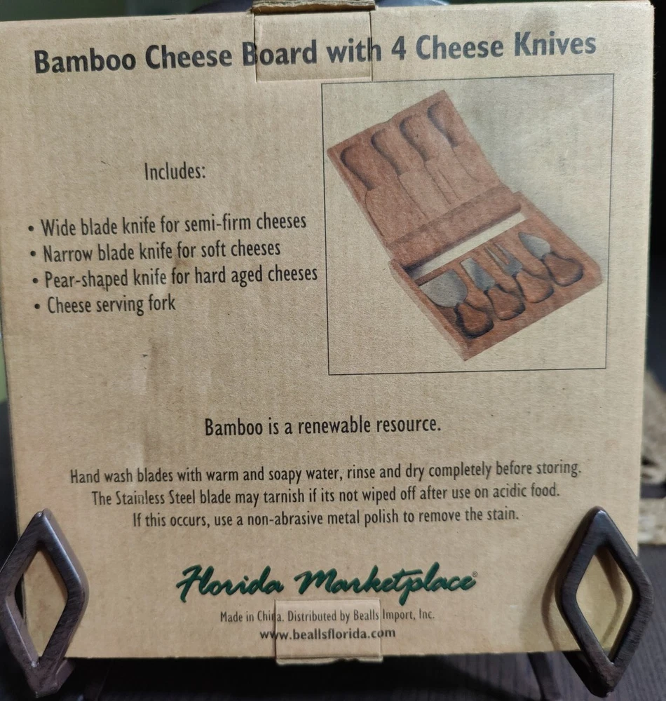 Bamboo Cheese Board with Cheese Knives (3) Cheese Fork (1) Magnetic Storage inside. 7.50" x 7.50" 1.875" high. Used with the original box. Usage wear and scuffing on Wood board and handles. See photos.