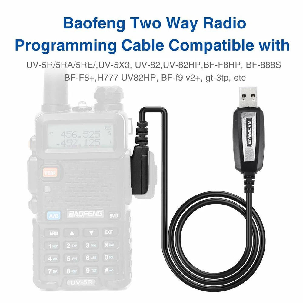 Description: This item is the cable that using to connect your Radio and PC, then writes the program setting and frequency of the walkie talkie by PC. 1. All of our items are Brand New. 2. BAOFENG original quality. 3. Two-pin standard diameter: Ear 3.5mm stereo (top pin). Mic 2.5mm stereo (bottom pin). 4. Space of two-pin: 11mm. 5. Length: 100cm. 6. Weight: 26g. Applicable Models: Almost All The brand two way radio of China. Type Model Kenwood KPG KPG27D, KPG29D,KPG48D, KPG49, KPG55D, KPG56D, KPG62D, KPG66D, KPG69D, KPG70D,KPG74D, KPG75D, KPG77D, KPG82D, KPG87D Kenwood TH TH-D7, TH-D7A, TH-D7AG, TH-D7E, TH-F6, TH-F6A, TH-F7, TH-F7E, TH-G71, TH-G71A, TH-G71E, TH-K2, TH-K2A, TH-K2E, TH-K2ET, TH-21, TH-21AT, TH-21BT, TH-22, TH-22A, TH-22AT, TH-22E, TH-25, TH-26, TH-27, TH-28, TH31AT, TH31BT, TH41AT, TH41BT, TH-42, TH-42A, TH-42AT, TH-42E, TH-45, TH-46, TH-47, TH-48, TH-55, TH-75, TH-77, TH-G71, TH-205, TH-215, TH-225, TH-235, TH-235A, TH-235E, TH-315, TH-415, Kenwood TK TK-208/308,TK-220/320,TK-240/340, TK-240D/340D,TK-248/348, TK-250/350/353, TK-260/360,TK-260G/360G,TK-270/370, TK-270G/370G,TK-272G/372G/373G, TK-278G/378G/388GPro-Talk, TK-430/431, TK-2100/3100Pro-Talk,TK-2102/3102 Pro-Power,TK-2107/3107 ,Pro-Talk,TK2207,TK3207,TK-2160/3160 BAOFENG Almost All: AR-152,UV-13 PRO, GM-15 PRO, UV5R, UV-S9 PLUS, UVB5, UVB6, UV-8, UV8D, UV5RA, UV5RB, UV5RC, UV5RD, UV5RE, UV5REPlus, UV5RO, UV5RA+/BF-480/490/320/V6/V7/V8/658/520/530/999/888/777/666S/777S/888S/388A/A5/F8+/A52,BF-F8HP HYT TC286 386 2685 3865 6685, TC 278 378 388, TC 2100 2088 WOUXUN / PUXING / QUSHENGAN / LINTON / TYT etc Almost All with a two pin plug, former pin diameter of 3.5 mm and 2.5 mm in diameter after pin, double pin from 8 mm within, 11 mm center distance of 2 pin. Notice: If your walkie talkie type is not in the list above, please see my other items or email us your model number, then, we will help you find one that suits for you. Pocket includes: 1 x BAFOENG USB Programming Cable