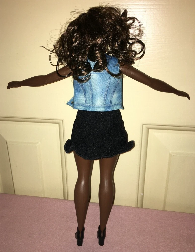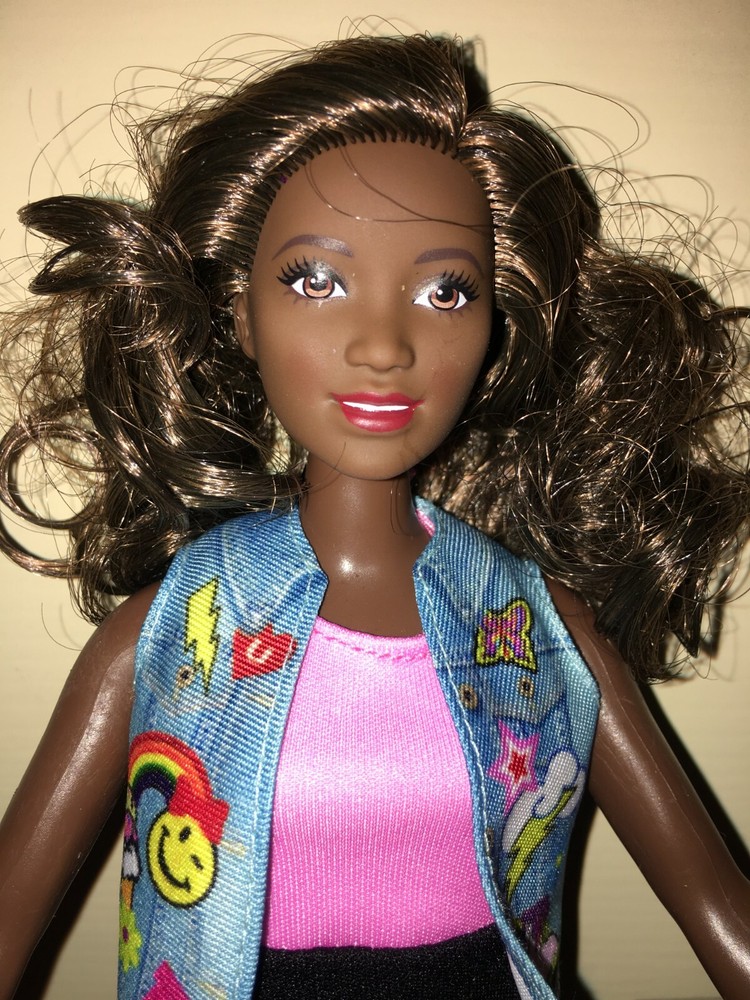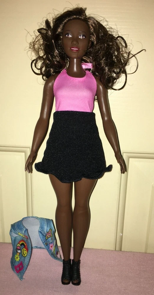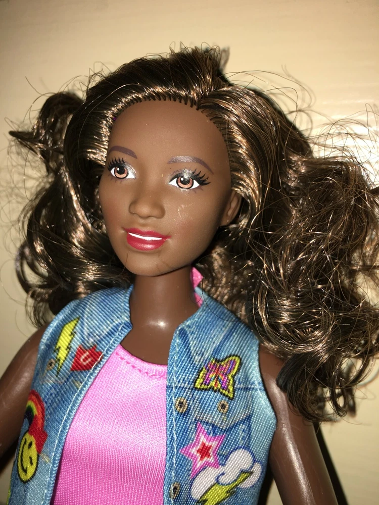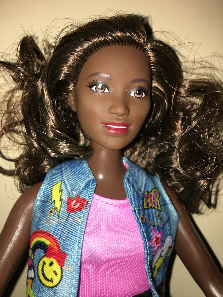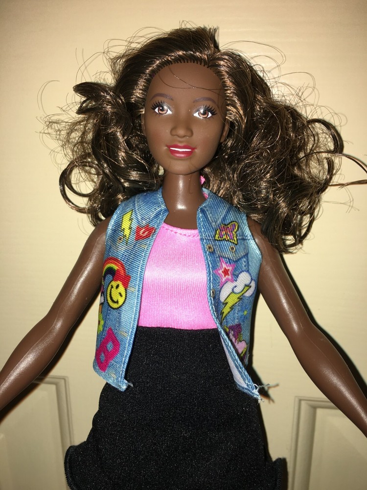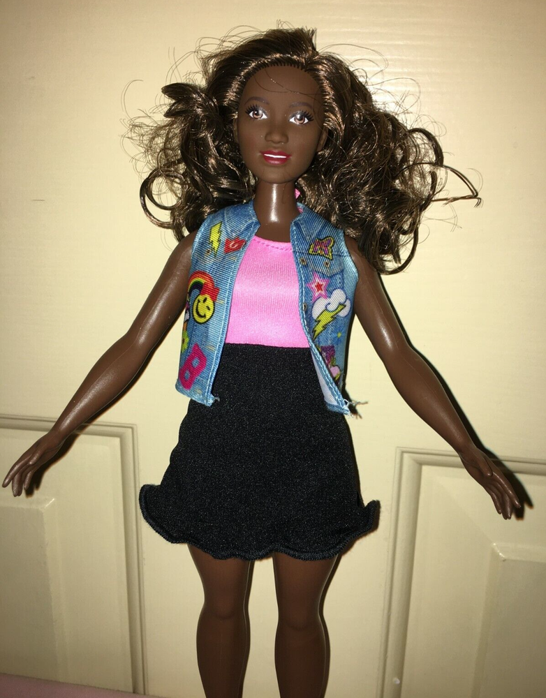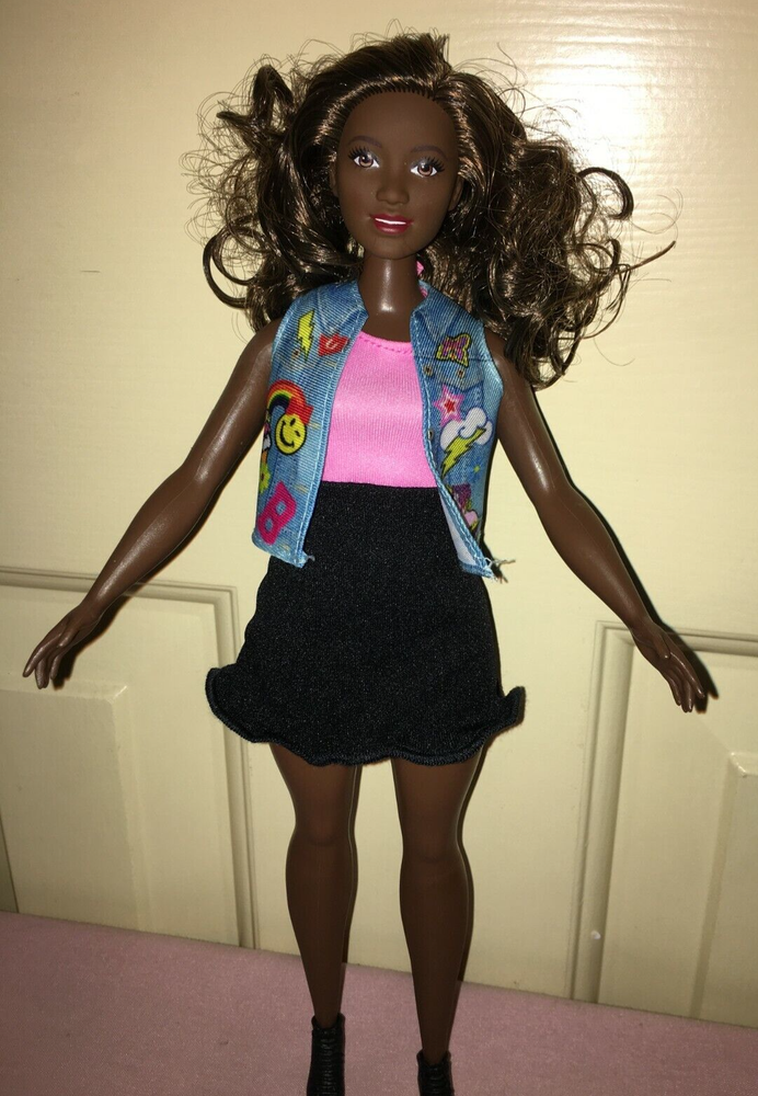 This listing is for a great looking doll, a Fashionistas Barbie released around 2016. She is the number 39 Fashionista, and was called the Emoji Fun Glasses Barbie, but this doll no longer has her glasses. She is an African American with the 'Curvy' figure. Her hair is long, bouncy, streaked brunette, parted on her left side. She has a dark complexion. Barbie's eyes are brown. Her lipstick is red. Her fashion is a dress that looks like a two-piece top and skirt, but it is one piece with a pink top, and black skirt area. There is a cute little jean-looking vest with a colorful graphic design on the front. On her feet are short open-toe lace-up black boots. An imprint on the back of head shows 2014 Mattel. Her back has one that shows 2015 Mattel ~ 1186 MJ, 1, NL ~ Made in China. The doll has been played-with, but is in excellent condition, except as noted. Hopefully the pictures will do this doll justice. ~~ Please see my other listed items. Buyer to pay all shipping & handling costs, but shipping may be combined (for destinations in the U.S. only). International bidders will be responsible for separate shipping costs for each item purchased. ~~ My combined shipping policy is this: I weigh the entire package after you have finished bidding over a week's time (unless we agree ahead of time to a different timeframe). I estimate the shipping fee based on that weight and your zip code, using the USPS website. I add a $2 handling fee for the first item. That fee is already included in the amount shown on the item description’s shipping calculator. It covers the costs for packaging, printing, and gasoline. Delivery confirmation is covered at no extra cost. I charge $1 handling for each additional item. I ship locally using USPS Priority Mail. Feel free to message me for an estimate if you are considering bidding on multiple items, or if you have any questions. Please be sure to request a combined-shipping invoice if you win multiple items from me. Also, if you are a return customer, remind me and I may be able to reduce the handling fees. Thank you for looking.
